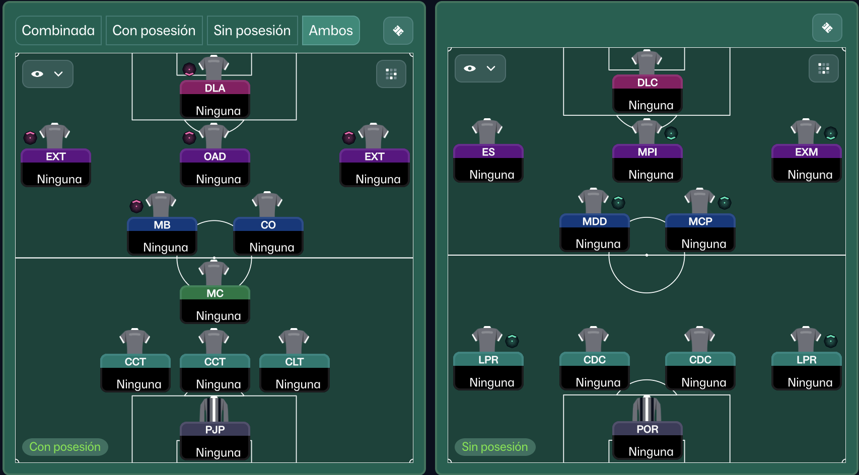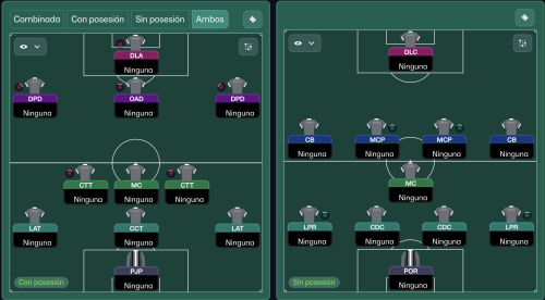 *En ambos casos cambio a OFENSIVO desde el inicio del partido, salvo que el rival sea muy superior. En todos los casos recomiendo que los 3 defensas aunque puedan jugar de laterales sean también centrales. El MCD que baja a linea defensiva no tiene porque ser necesariamente central pero sí que sea un perfil muy defensivo.