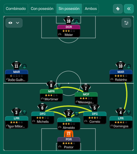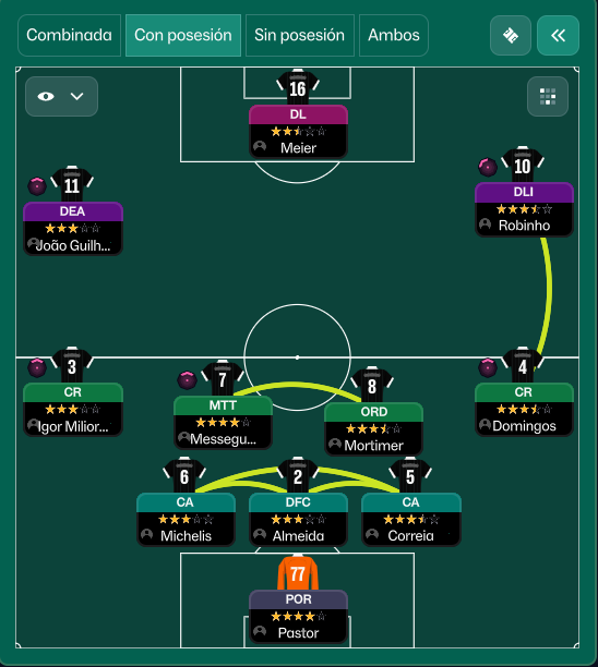 Estuve probando muchas tácticas la primera temporada (típicas 433 o 4231 con linea super adelantada y ritmo muy alto pero no me funcionaron como quería) hasta que se me ocurrió esta táctica ya que tenia centrales de sobra y la verdad desde el primer día me sorprendió lo efectivo que es defender en bloque bajo en este FM.