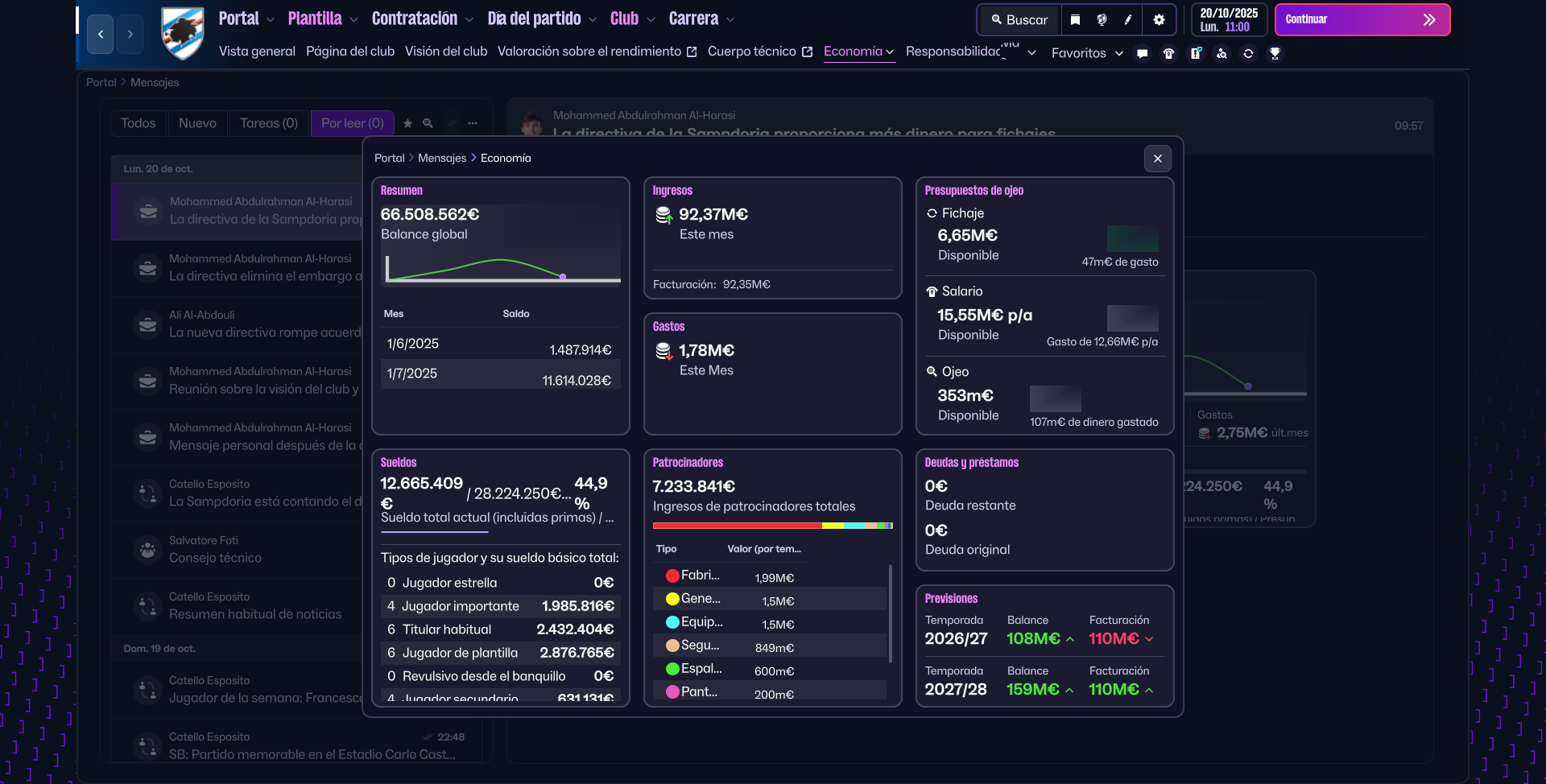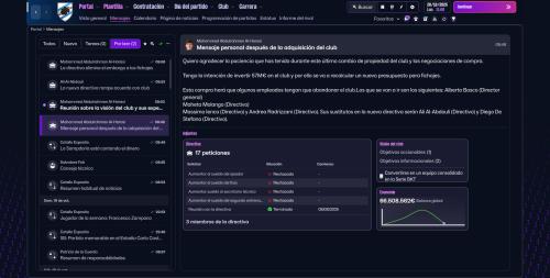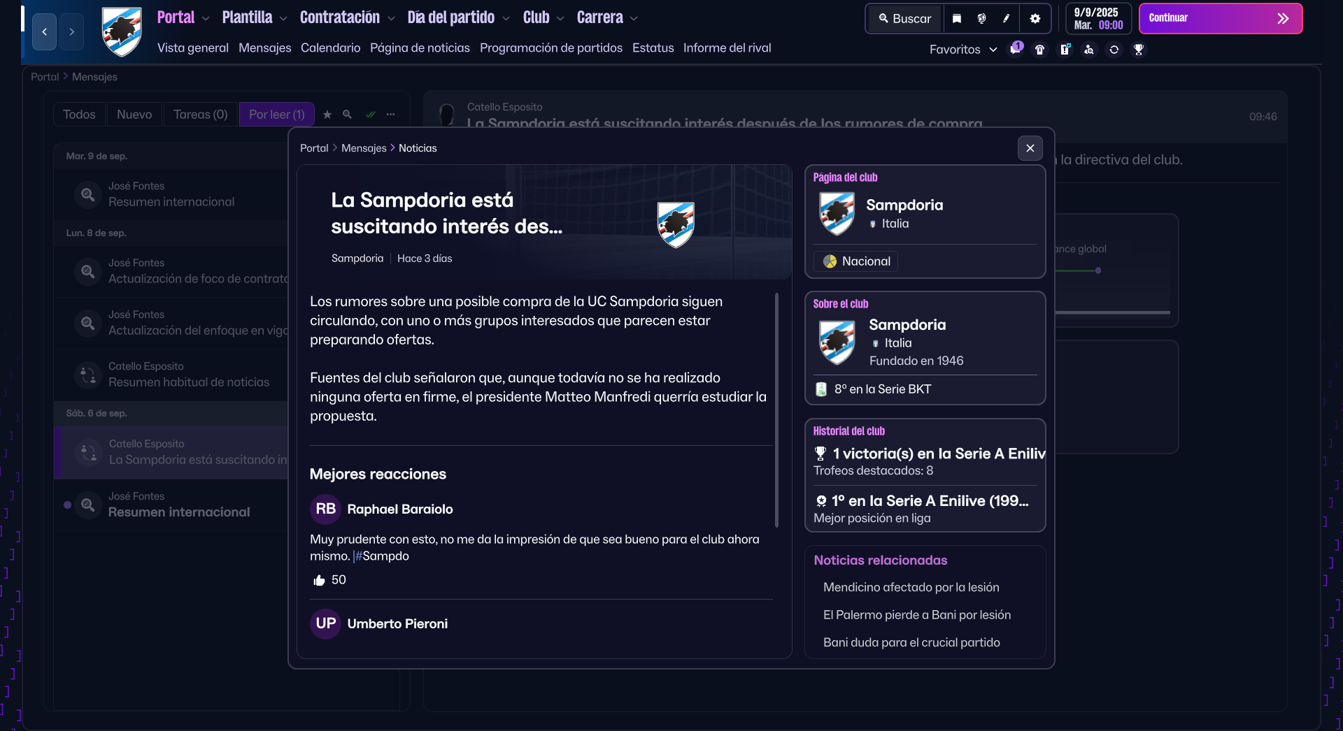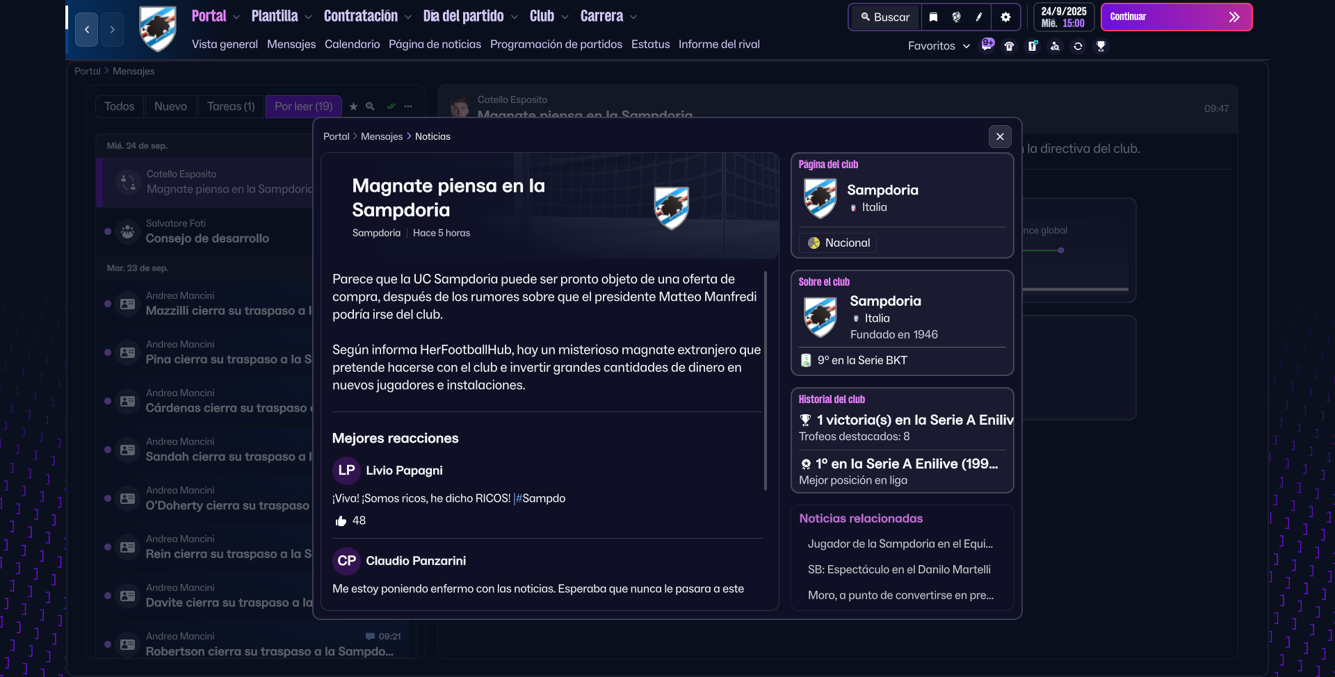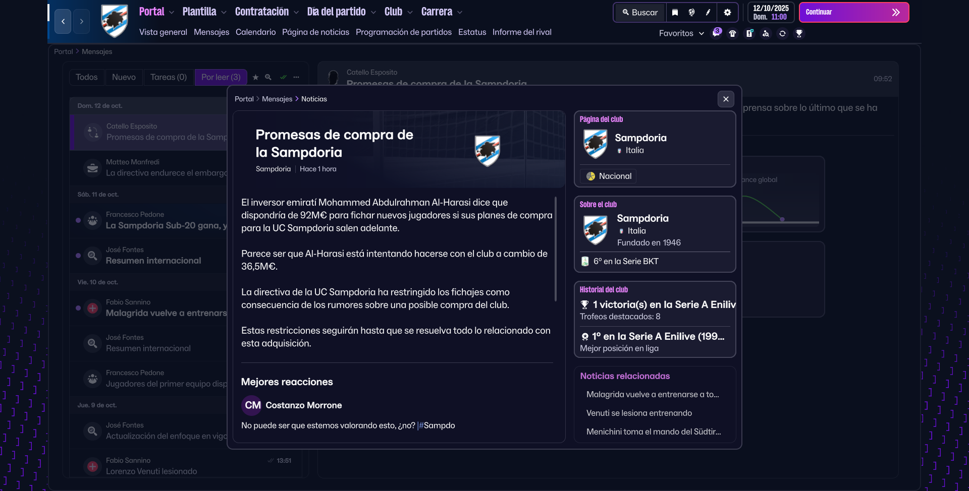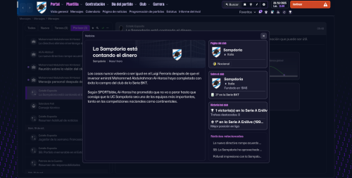Pues eso. Un magnate emiratí llamado Mohammed Abdulrahman Al-Harasi ha comprado la Sampdoria en mi partida del FM26 con este equipo. Podéis ver todo el proceso de compra en las imágenes previas.