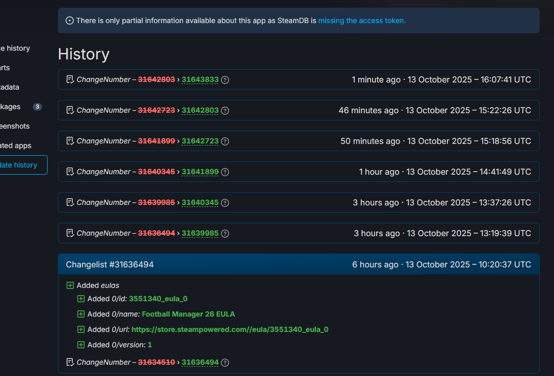 Aquí: https://steamdb.info/app/3551340/history/