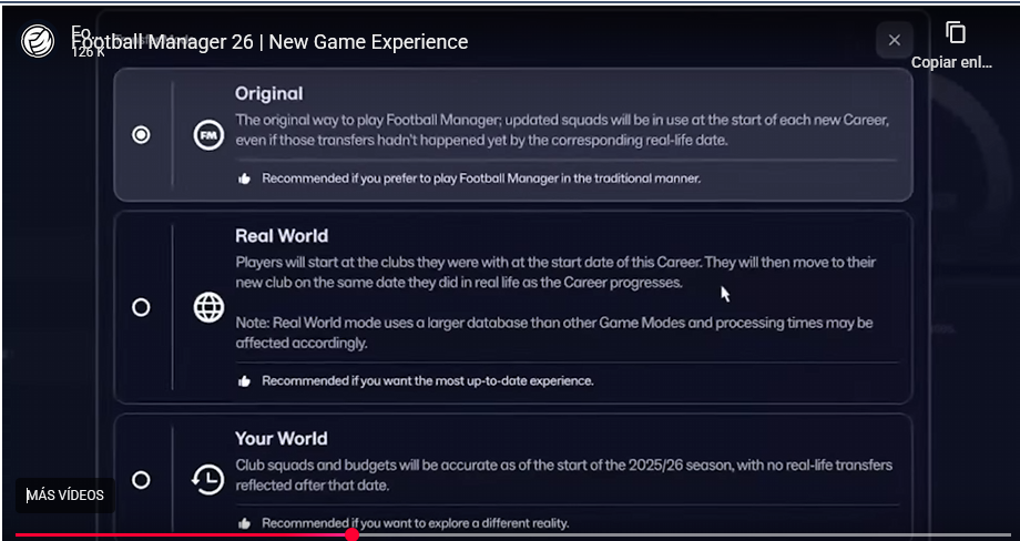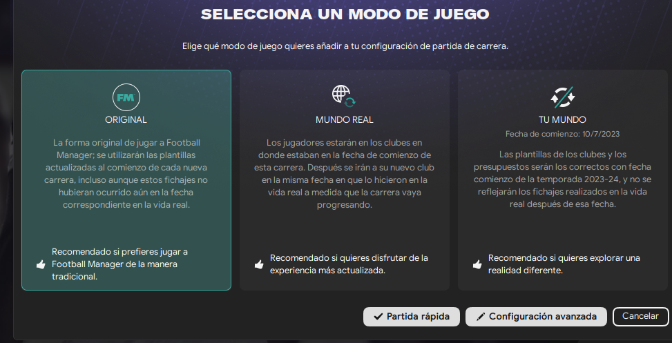 Esto es lo que incluyeron en FM24, de como querías empezar tu partida. Los tres modos.