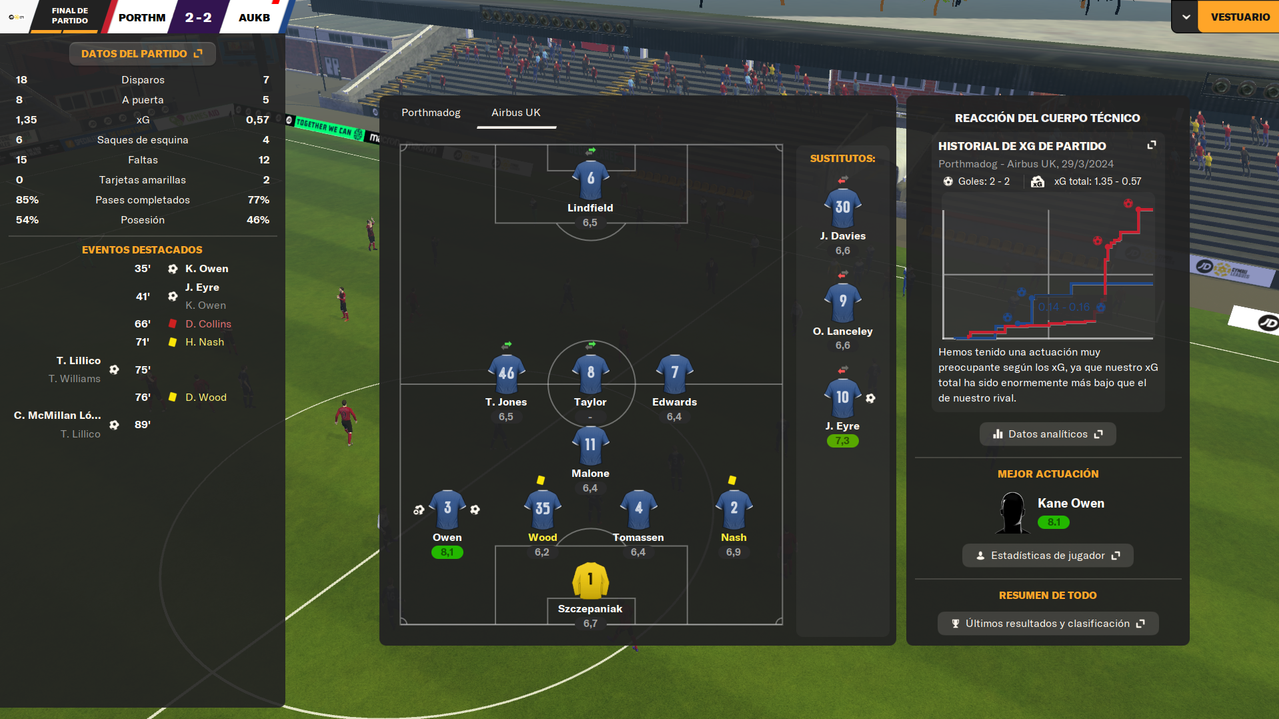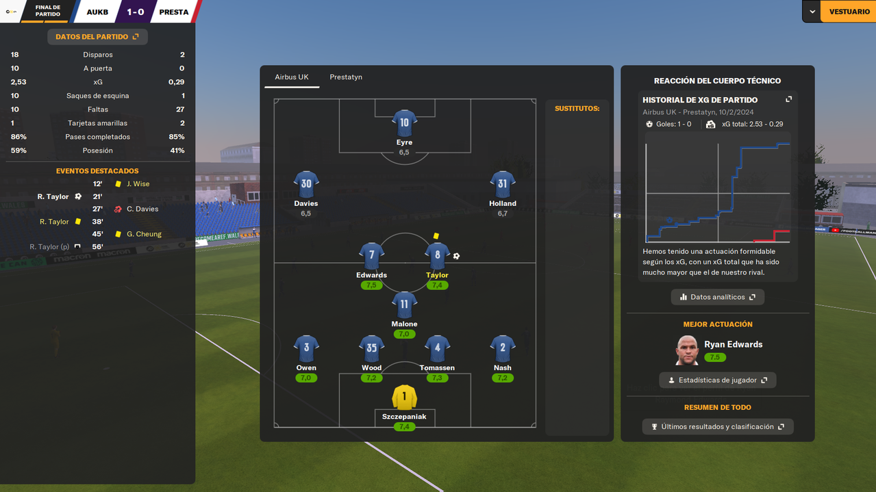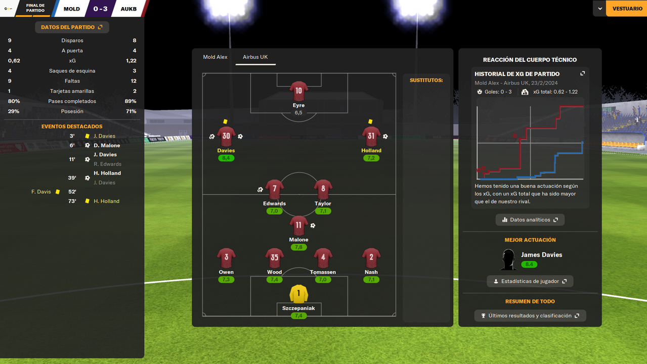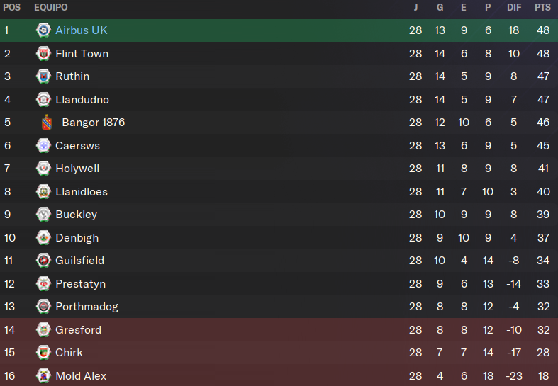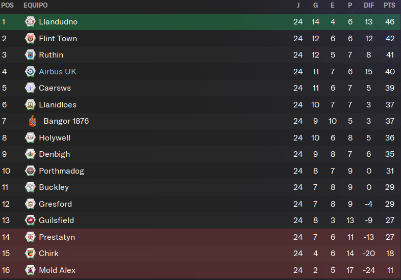 Hace 17 horas17 horas Autor Experto - Llegaba Febrero y lo hacía con la visita al Ruthin Town, rival directísimo que estaba solo un punto por encima nuestro. Y tras una primera parte sin tiros a puerta por parte de ninguno de los dos equipos, y en la que lo más destacado era la lesión de Collins a los 12 minutos, a los 30 segundos de la reanudación Dier hacía el 1-0 tras un desajuste defensivo. Empezamos a embotellar al rival, y un disparo cruzado de Lanceley hacía el empate, en la que prácticamente fue la última ocasión del partido Al dia siguiente, las pruebas médicas de Collins arrojaban un resultado preocupante: Una lesión del abductor dejaba a nuestro extremo izquierdo titular un mes alejado de los terrenos de juego A pesar de que el mercado de traspasos se había cerrado, el Cefn Druids hacía una oferta para llevarse a Nick Rushton, uno de los tres rebeldes que habían tratado de forzar mis decisiones a principio de temporada. Y con el jugador siendo suplente habitual, y con un sueldo bastante elevado, decidíamos aceptar la oferta La salida de Rushton dejaba un hueco en la plantilla, que decidíamos cubrir con un jugador de la cantera, el extremo Hugh Holland, que con 5 goles y 12 asistencias en 26 partidos era uno de los jugadores más destacados del conjunto juvenil Perfil Holland- Recibiamos al Prestatyn Town, el rival que nos había infligido la derrota más dolorosa de la temporada en el partido de ida. Salimos dispuestos a cobrarnos venganza, y un golazo de Taylor de falta directa nos ponía por delante en el marcador en el 21. Davies, con un buen cabezazo, nos metía el susto en el cuerpo apenas 6 minutos después, pero el gol era anulado por fuera de juego, y nos íbamos al descanso con mínima ventaja. Pudimos sentenciar con un penalti lanzado por Taylor, pero el disparo se fue al poste y tuvimos que sufrir hasta el pitido final para poder terminar con la racha de 7 partidos sin ganar - Cerrabamos el mes visitando al colista Mold Alexandra, casi descendido y que apenas opuso resistencia. Un disparo desde la frontal de Malone en el 6, su primer gol con el equipo, nos adelantaba en el marcador, y otro misil, de Davies, en el 11, dejaban el partido sentenciado por la vía rápida. Y aún llegaría otro gol antes del descanso, del juvenil Holland, para hacer el 0-3 que dejaba la segunda parte como un trámite para llevarnos los 3 puntos Partidos FebreroClic en la imagen para ver la clasificación completa La reacción parece haber llegado demasiado tarde, y somos cuartos, a 6 puntos del líder Llandudno, cuando quedan solo 6 jornadas por disputar, con Flint Town, segundo clasificado, y Ruthin, tercero, dos y un punto por encima nuestro. Por abajo, se aprietan las cosas, aunque el Mold Alexandra podría descender matemáticamente ya la próxima jornada, y el Chirk está a 9 puntos de la salvación. Y para evitar la última plaza de descenso, hay 4 equipos en dos puntos, con el Prestatyn ocupando esa posición que lleva a la Liga Ardal en este momentoPróximos partidos Dos de nuestros jugadores eran elegidos en el equipo del mes, el central Dan Wood y el lateral izquierdo Kane Owen Equipo del mes