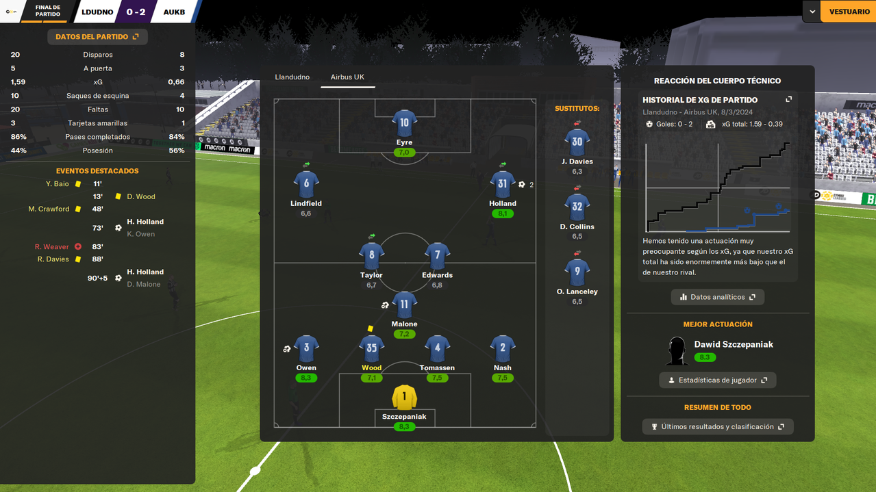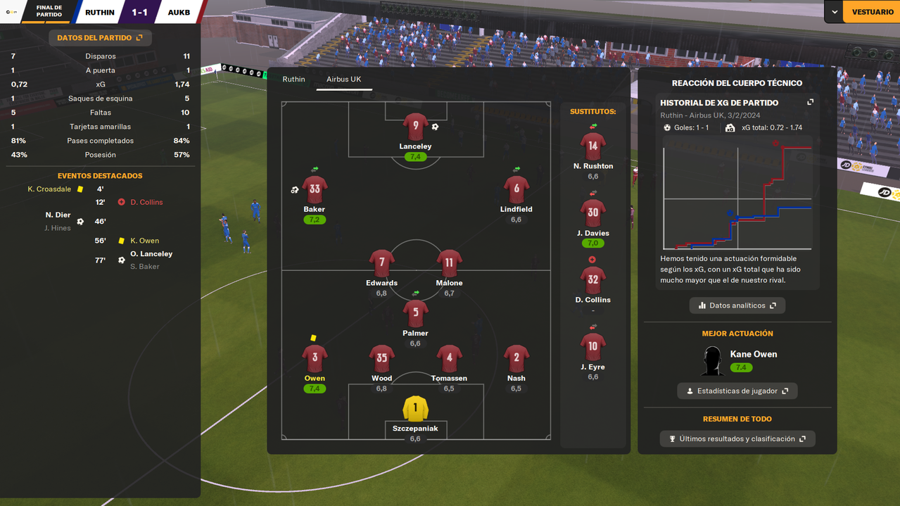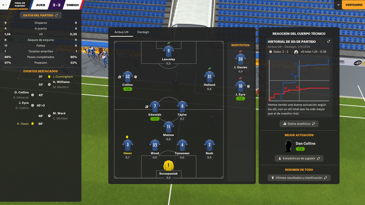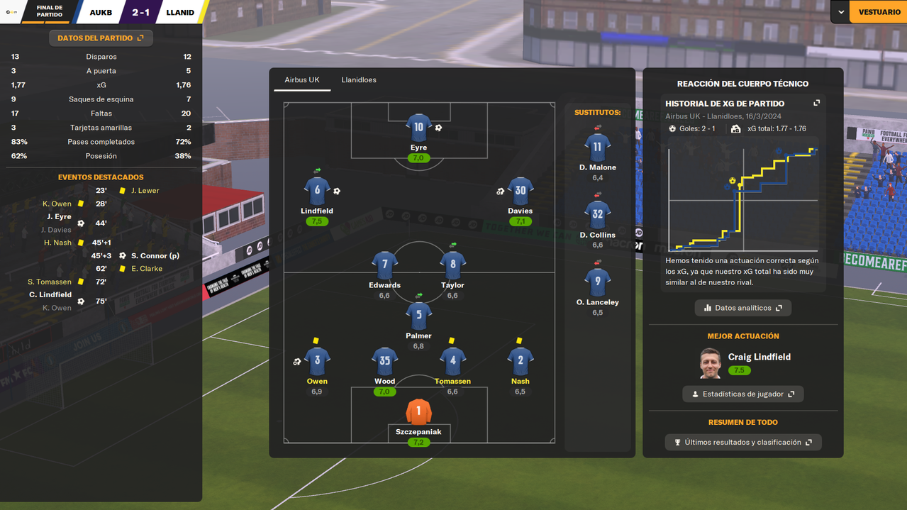 Hace 17 horas17 horas Autor Experto - Llegaba Febrero y lo hacía con la visita al Ruthin Town, rival directísimo que estaba solo un punto por encima nuestro. Y tras una primera parte sin tiros a puerta por parte de ninguno de los dos equipos, y en la que lo más destacado era la lesión de Collins a los 12 minutos, a los 30 segundos de la reanudación Dier hacía el 1-0 tras un desajuste defensivo. Empezamos a embotellar al rival, y un disparo cruzado de Lanceley hacía el empate, en la que prácticamente fue la última ocasión del partido Al dia siguiente, las pruebas médicas de Collins arrojaban un resultado preocupante: Una lesión del abductor dejaba a nuestro extremo izquierdo titular un mes alejado de los terrenos de juego A pesar de que el mercado de traspasos se había cerrado, el Cefn Druids hacía una oferta para llevarse a Nick Rushton, uno de los tres rebeldes que habían tratado de forzar mis decisiones a principio de temporada. Y con el jugador siendo suplente habitual, y con un sueldo bastante elevado, decidíamos aceptar la oferta La salida de Rushton dejaba un hueco en la plantilla, que decidíamos cubrir con un jugador de la cantera, el extremo Hugh Holland, que con 5 goles y 12 asistencias en 26 partidos era uno de los jugadores más destacados del conjunto juvenil Perfil Holland- Recibiamos al Prestatyn Town, el rival que nos había infligido la derrota más dolorosa de la temporada en el partido de ida. Salimos dispuestos a cobrarnos venganza, y un golazo de Taylor de falta directa nos ponía por delante en el marcador en el 21. Davies, con un buen cabezazo, nos metía el susto en el cuerpo apenas 6 minutos después, pero el gol era anulado por fuera de juego, y nos íbamos al descanso con mínima ventaja. Pudimos sentenciar con un penalti lanzado por Taylor, pero el disparo se fue al poste y tuvimos que sufrir hasta el pitido final para poder terminar con la racha de 7 partidos sin ganar - Cerrabamos el mes visitando al colista Mold Alexandra, casi descendido y que apenas opuso resistencia. Un disparo desde la frontal de Malone en el 6, su primer gol con el equipo, nos adelantaba en el marcador, y otro misil, de Davies, en el 11, dejaban el partido sentenciado por la vía rápida. Y aún llegaría otro gol antes del descanso, del juvenil Holland, para hacer el 0-3 que dejaba la segunda parte como un trámite para llevarnos los 3 puntos Partidos FebreroClic en la imagen para ver la clasificación completa La reacción parece haber llegado demasiado tarde, y somos cuartos, a 6 puntos del líder Llandudno, cuando quedan solo 6 jornadas por disputar, con Flint Town, segundo clasificado, y Ruthin, tercero, dos y un punto por encima nuestro. Por abajo, se aprietan las cosas, aunque el Mold Alexandra podría descender matemáticamente ya la próxima jornada, y el Chirk está a 9 puntos de la salvación. Y para evitar la última plaza de descenso, hay 4 equipos en dos puntos, con el Prestatyn ocupando esa posición que lleva a la Liga Ardal en este momentoPróximos partidos Dos de nuestros jugadores eran elegidos en el equipo del mes, el central Dan Wood y el lateral izquierdo Kane Owen Equipo del mes