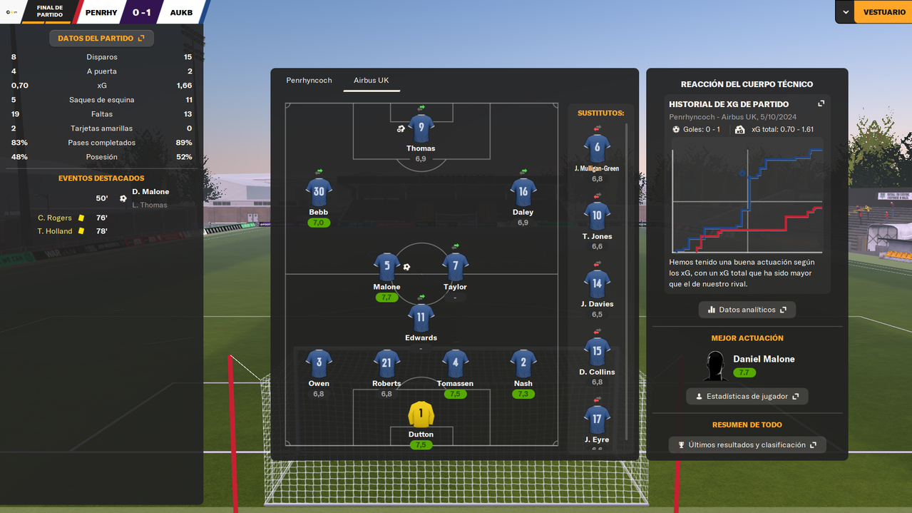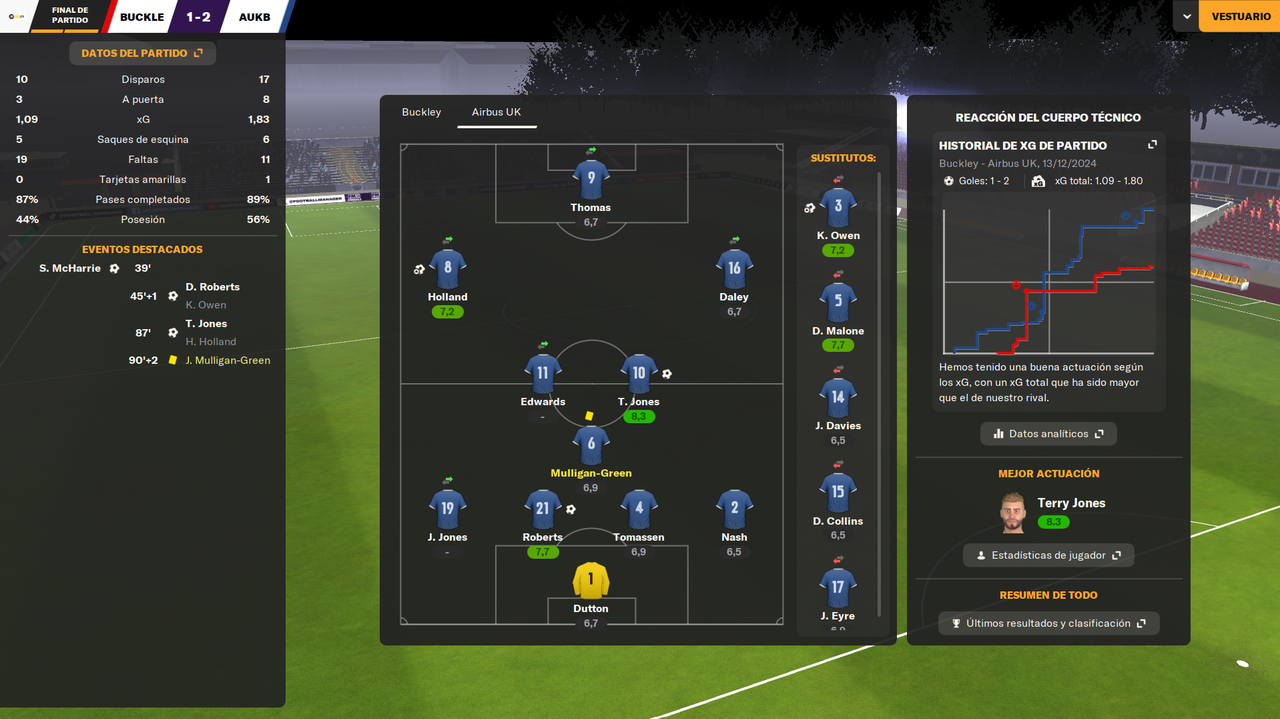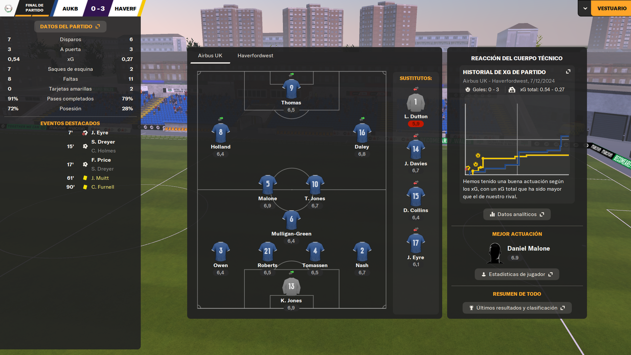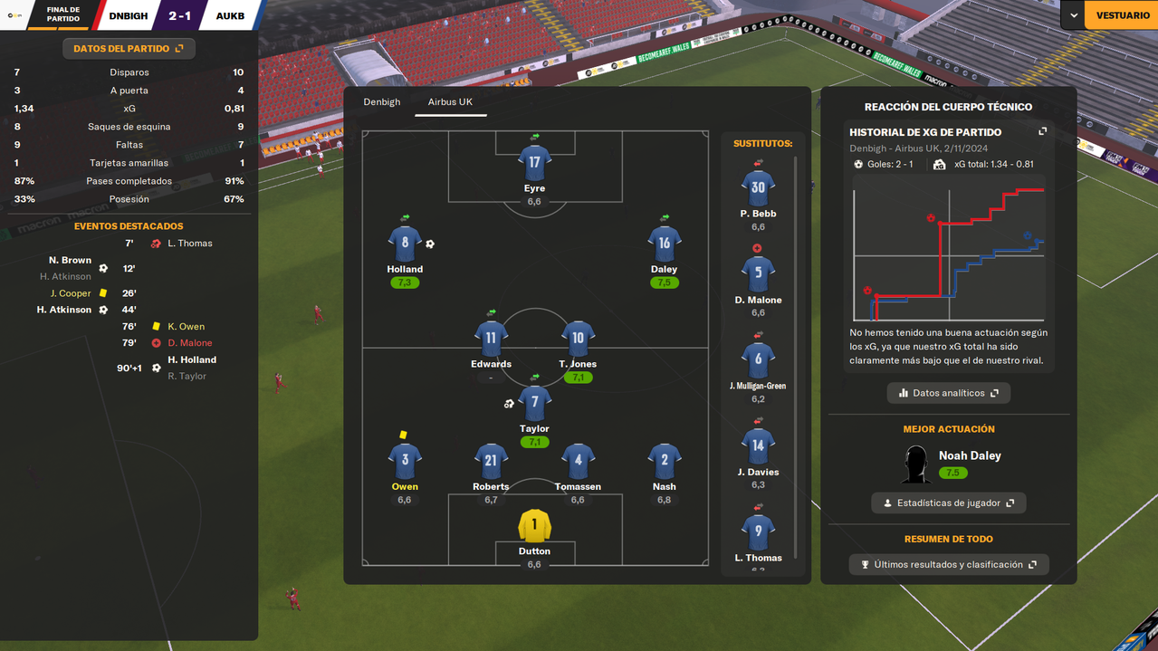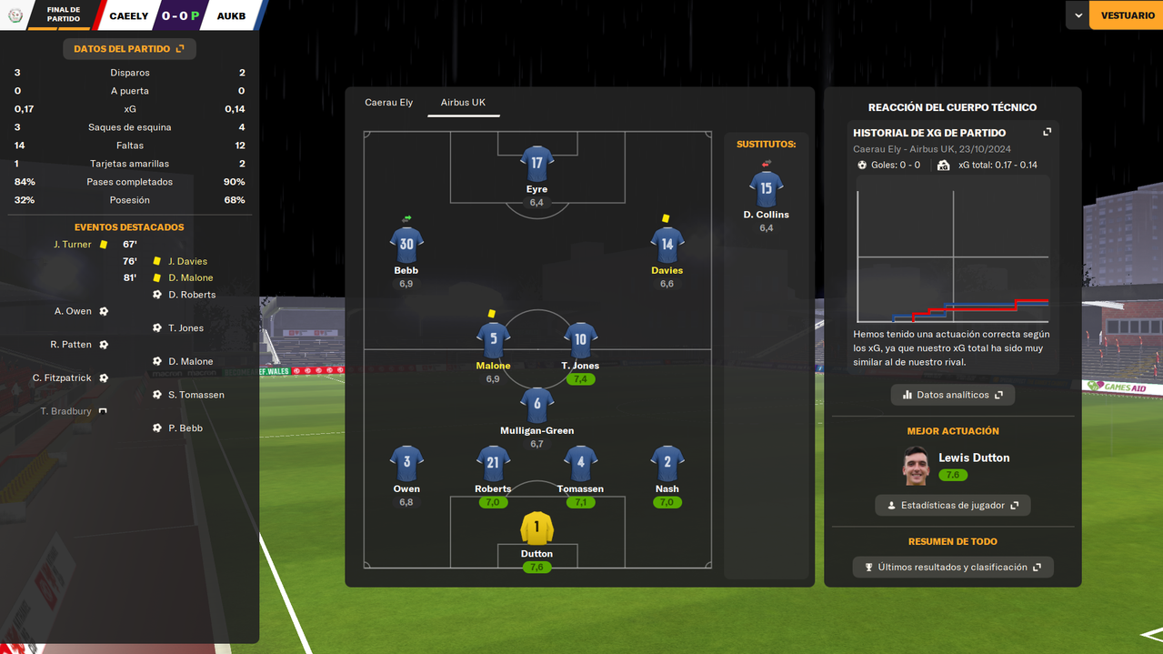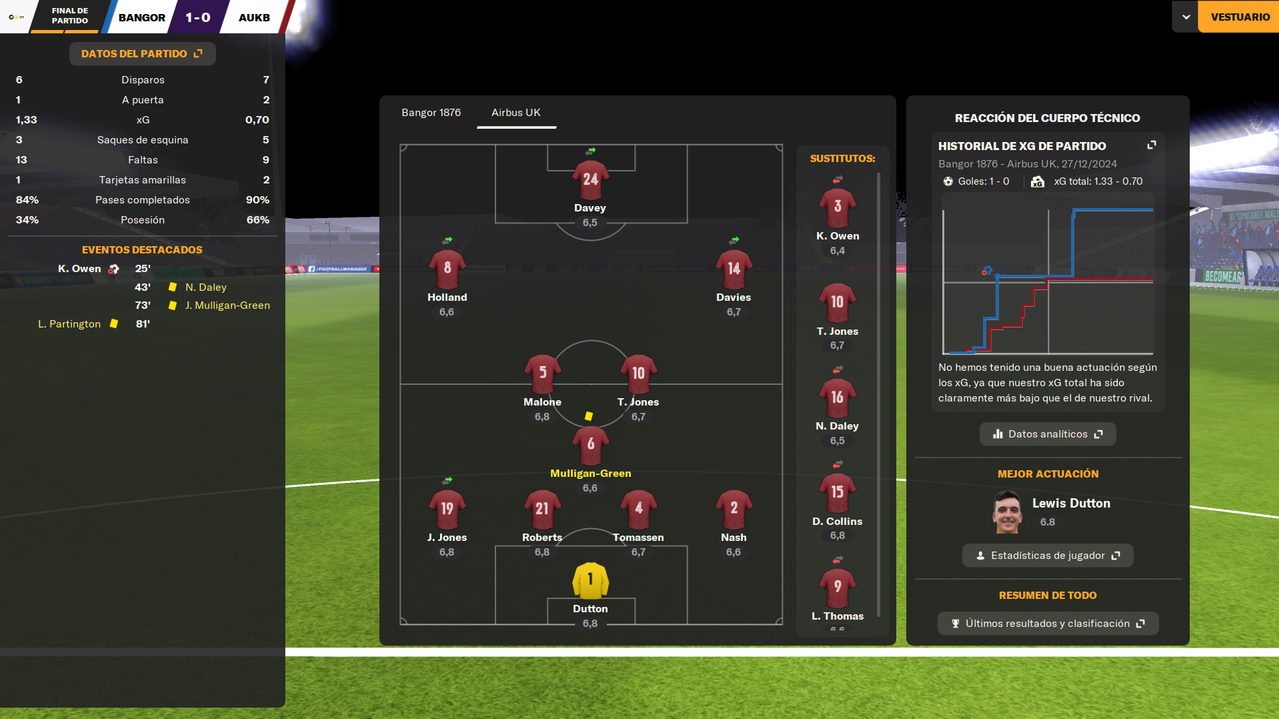 • Despedíamos el 2024 visitando a un rival directo como el Bangor City, con la posibilidad de asegurar el liderato en caso de ganar. Y en un partido igualado, en el que fuimos ligeramente superiores, una falta de entendimiento entre Dutton y Owen terminaba con el lateral marcándose el 1-0 en propia puerta a los 25 minutos de juego. Tras la reanudación, los locales durmieron el partido, y aunque tuvieron una gran ocasión que desbarató Tomassen bajo palos, el marcador ya no se movió hasta el pitido final