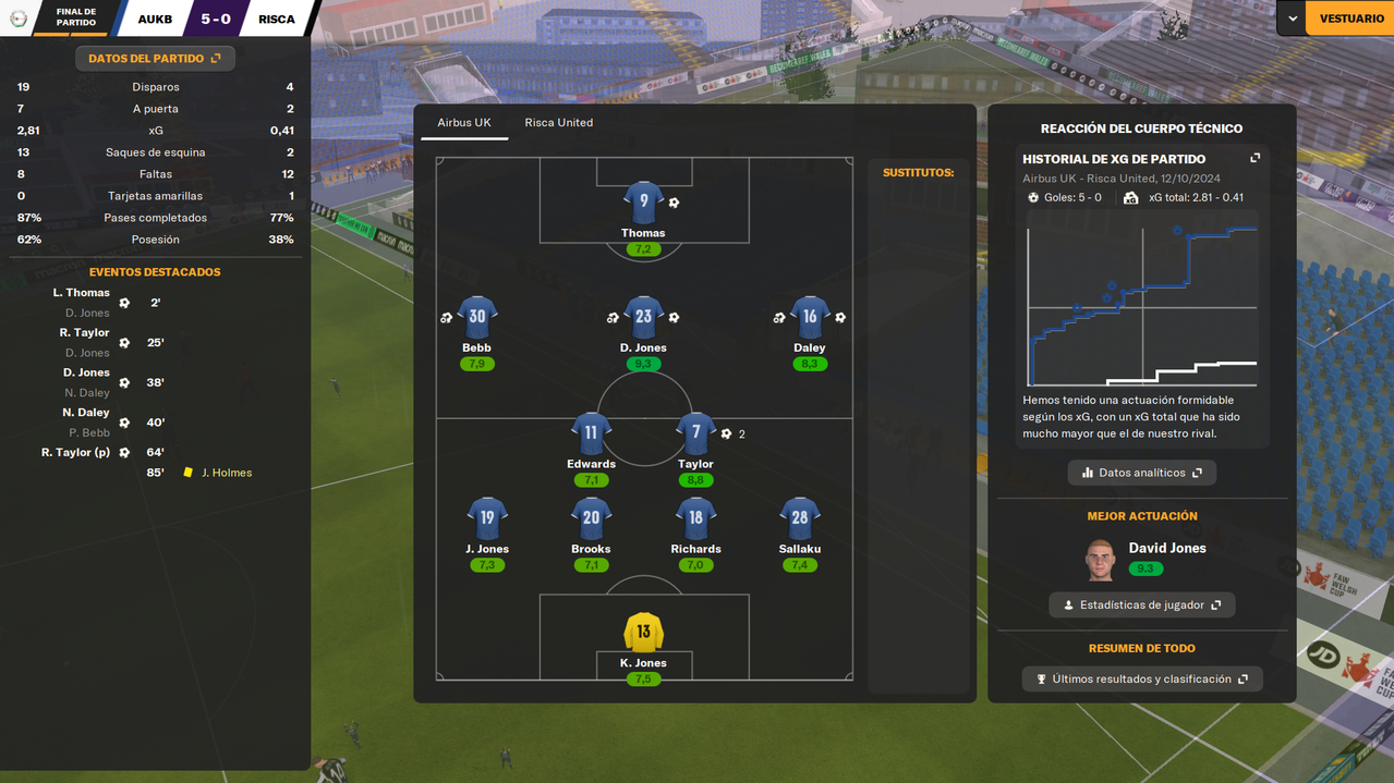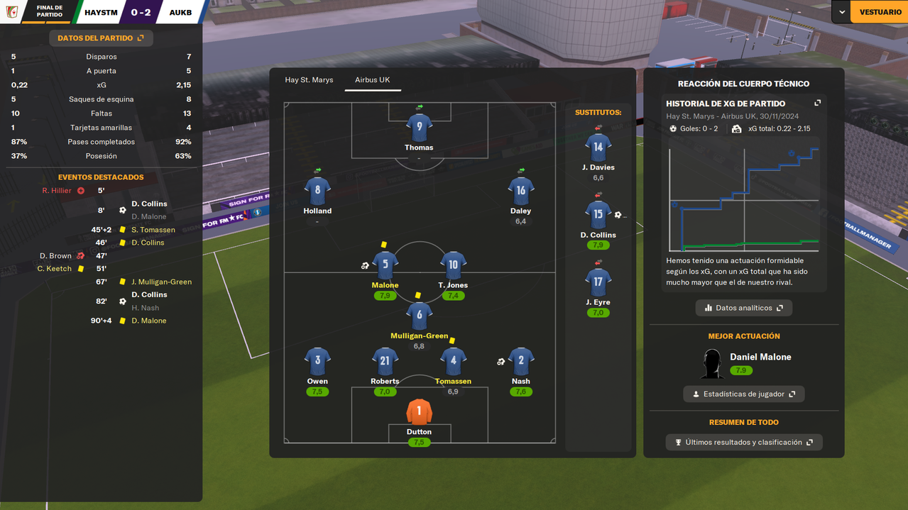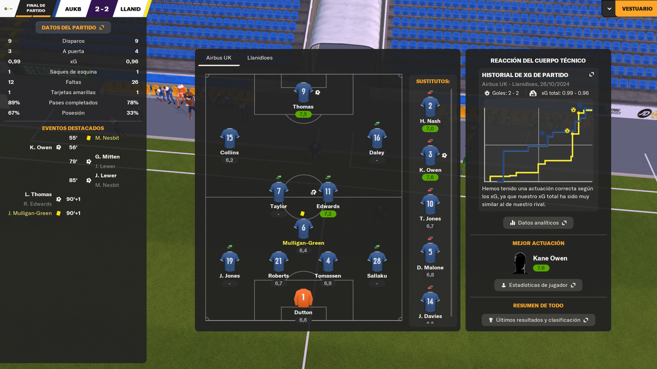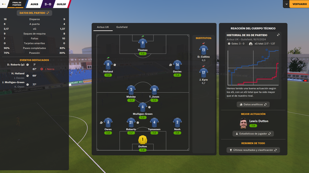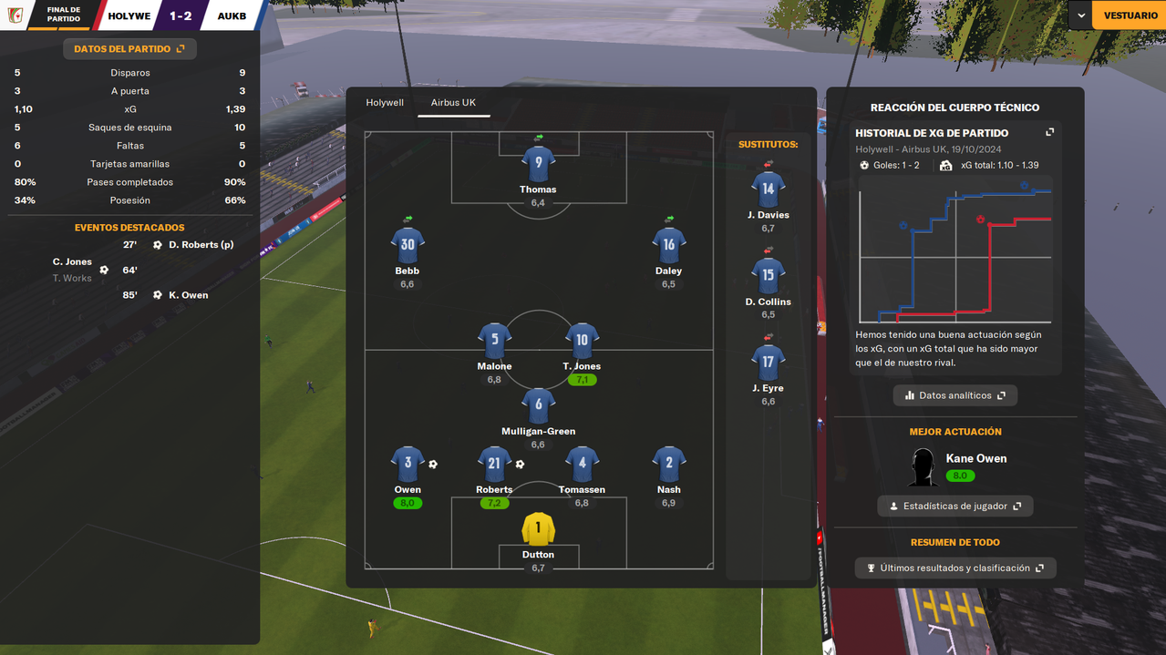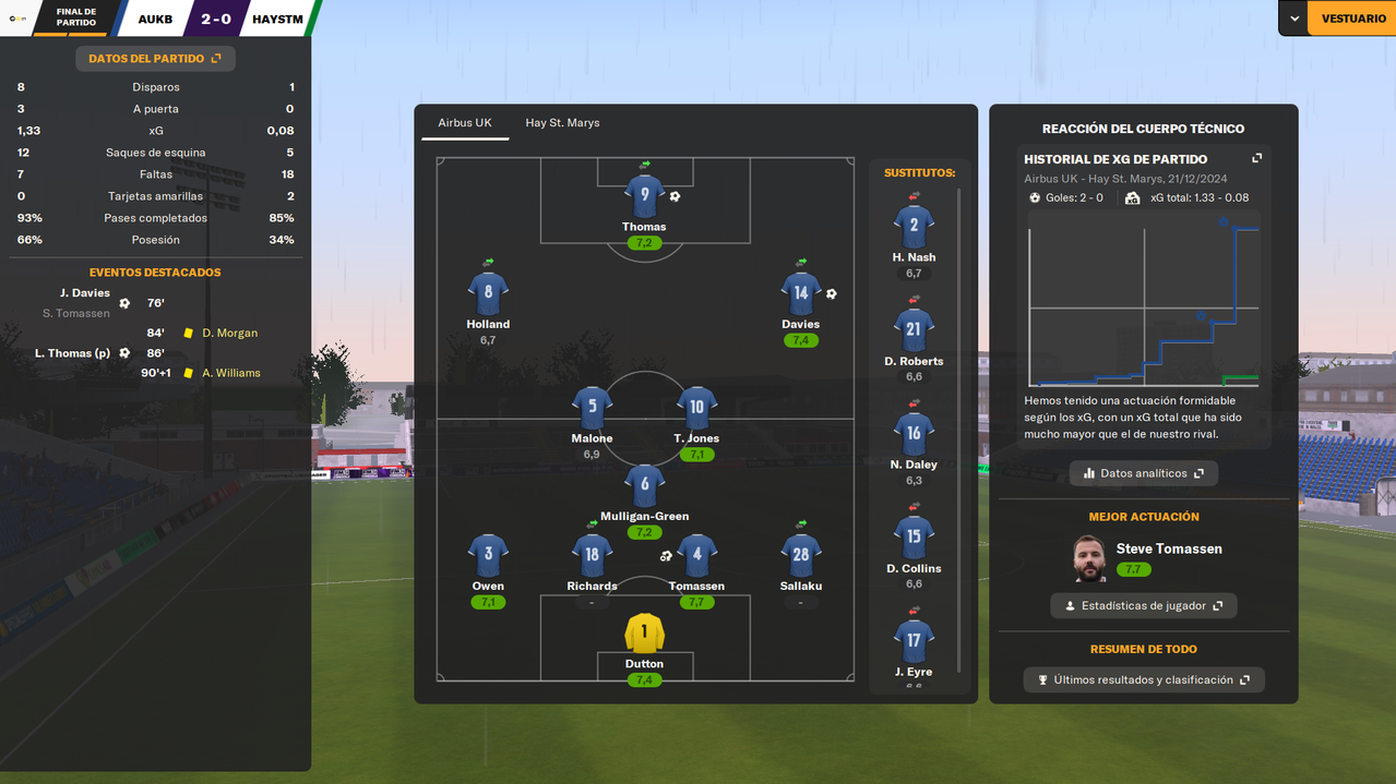 • Despedíamos el 2024 visitando a un rival directo como el Bangor City, con la posibilidad de asegurar el liderato en caso de ganar. Y en un partido igualado, en el que fuimos ligeramente superiores, una falta de entendimiento entre Dutton y Owen terminaba con el lateral marcándose el 1-0 en propia puerta a los 25 minutos de juego. Tras la reanudación, los locales durmieron el partido, y aunque tuvieron una gran ocasión que desbarató Tomassen bajo palos, el marcador ya no se movió hasta el pitido final