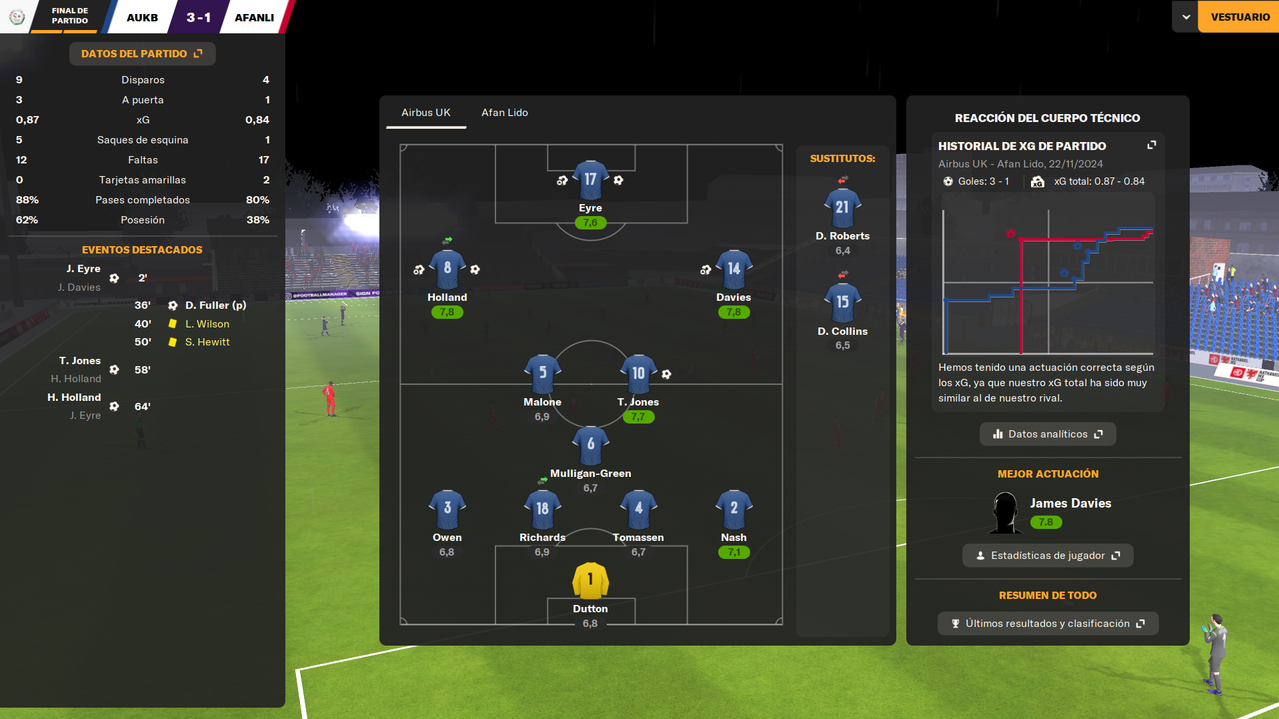 Tiene pinta de que si, que llegaremos al último partido de liga con todo en juego. Nadie afloja en esta liga (aprovecho para recordar que en "Kilometro cero" hice 3 temporadas en Gales, con el Prestatyn perdí la JD Cymru North por goalaverage el primer año y por un punto el segundo, y con el Connah's Quay la JD Cymru Premier por un punto el tercero, espero que en esta historia vaya un poco mejor), ni por arriba ni por abajo, asi que debemos mantener este nivel hasta final de temporada si queremos tener opciones