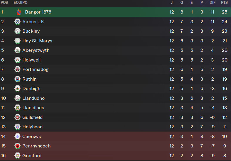 Nos mantenemos en la segunda posición, a un punto del líder Bangor y con el Buckley un punto por detrás, aunque sigue la igualdad máxima, con los 8 primeros en solo 6 puntos de distancia. Por abajo, es colista el Gresford, con el Penrhyncoch y el Caersws completando los puestos de descenso