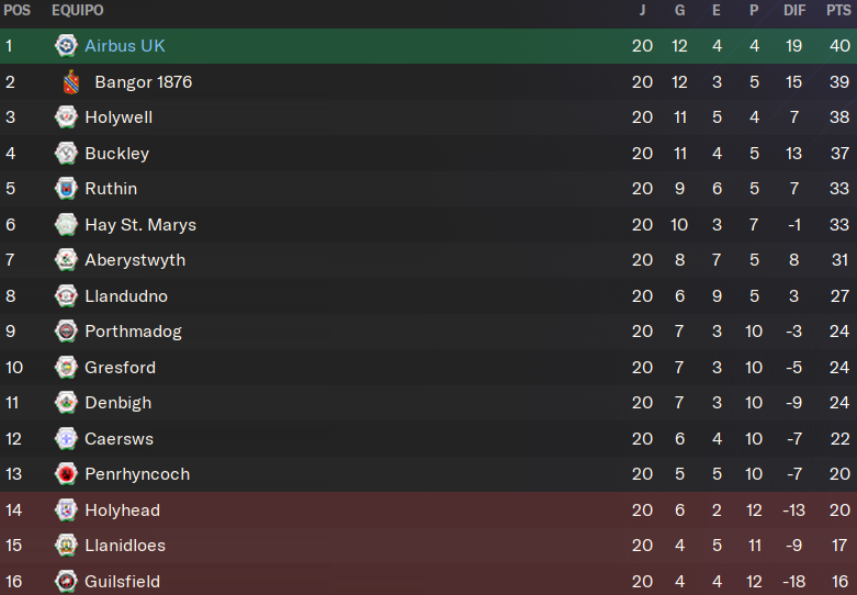 Finalizamos Enero como líderes, con un punto de ventaja sobre el Bangor, dos sobre el Holywell y tres sobre el Buckley. Parece que los 4 seremos los que nos juguemos el ascenso, ya que el Ruthin, quinto clasificado, ya está a 7 puntos de distancia. Mientras, por abajo, Guilsfield y Llanidloes se resisten a descolgarse, con Holyhead y Penrhyncoch peleando por evitar la tercera plaza de descenso