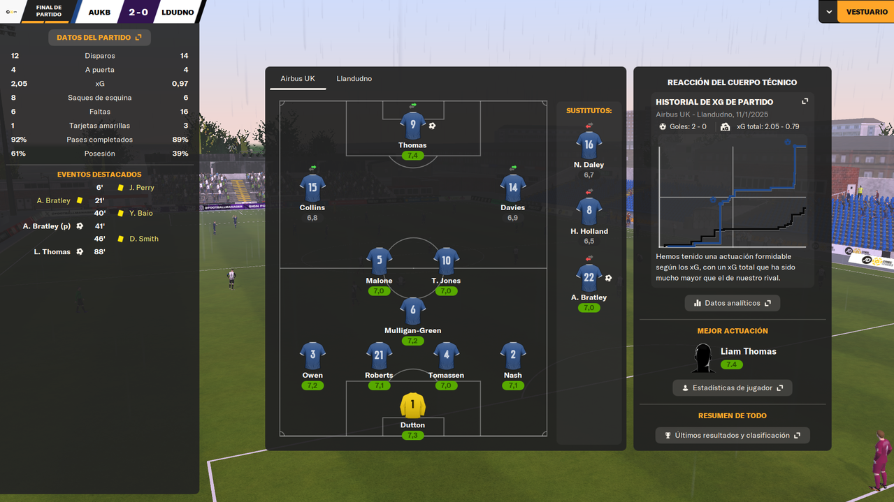 • Recibiamos a otro equipo de mitad de tabla, el Llandudno, que nos hizo sufrir durante buena parte de la primera mitad, sin conseguir generar nada de peligro hasta que un penalti cometido sobre Owen lo transformaba Bratley en el 1-0, marcador con el que nos íbamos al descanso. En la segunda mitad, siguió el mismo guión, un partido feo y sin apenas ocasiones que sentenciaba Thomas en el 88 al recoger un balón muerto en el área pequeña tras un corner y fusilar a Chadwick para el definitivo 2-0