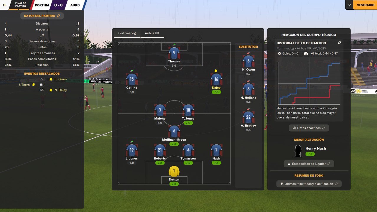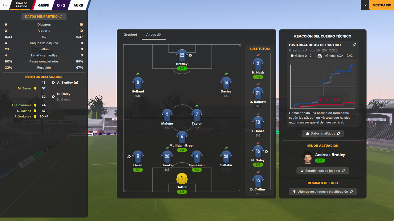 A.R – Yo creo que el Airbus tiene el partido donde Ansodi quiere. Apenas ha sufrido, se ha repuesto rápidamente al gol encajado, y domina el balón. Quizá la nota discordante esté siendo Daley, que más allá de su gran ocasión, no ha estado nada fino en esta primera mitad