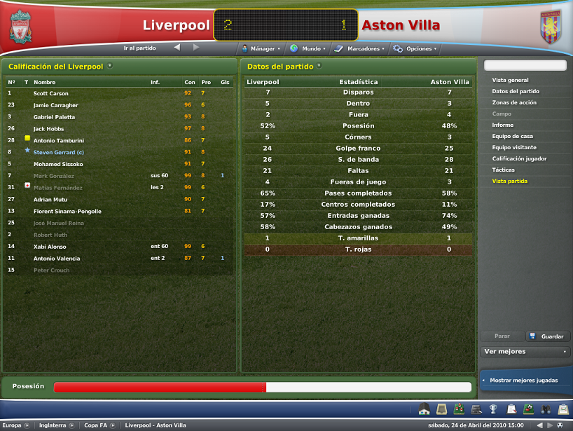 Sacando un valiosísimo empate en Old Trafford contra el Mancheser United, el Liverpool arrancaba un mes fructífero. Ganándole también en dos ocasiones al Aston Villa por 2-1, una vez por la Premiership y otra por la FA Cup. La última le dio el pasaje a la Final de esta prestigiosa copa inglesa, que disputará contra el mismísimo Arsenal.