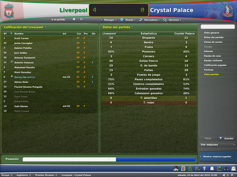 Quizá la mejor presentación del equipo en el mes fue la goleada arroyadora de 4-0 en Anfield Road contra el Crystal Palace, que se tambalea en la zona de peligro de la Premiership. La cuarta derrota en la temporada para el Liverpool se dio inesperadamente contra el Middlesbrough, que con una campaña más que pobre, deambula a mitad de tabla sin poder conseguir puestos de copas internacionales. El Middlesbrogh fue superior claramente, ante un Liverpool que rotó varios jugadores en el equipo titular y no pudo casi en ningún momento del partido imponer su estilo de juego. La última victoria obtenida al ganar 1-0 al Blackburn deja al Liverpool a un pequeñísimo paso de obtener la Premier League después de . Obteniendo un punto de los seis que quedan por disputar, el equipo de Anfield Road estaría festejando con anticipación la coronación de la Premiership 2009-2010..."