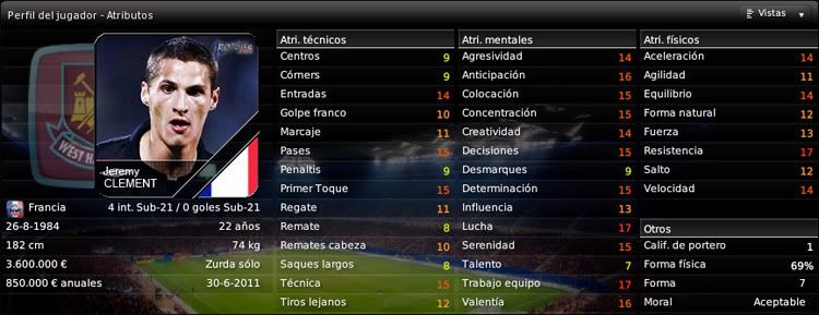 - Otro puesto cubierto con un jugador muy interesante, joven, completo y con proyección. Surgido de la cantera del Olympique, viene del PSG, a donde llegó en 2006 desde el Rangers escocés. Aunque parte como centrocampista defensivo, puede actuar perfectamente en el mediocentro. Tiene criterio, creatividad y técnica como para saber jugar la pelota, así que será el compañero ideal para Parker, al menos de momento. Sólo queda un jugador obligatorio por llegar: un mediocentro/mediapunta creativo para ser titular, por delante de Clément. Necesitamos fichar un "crack" que nos destaque dentro de la Premier. Espero que con todas las ventas que planeamos hacer juntemos suficiente dinero para ello.