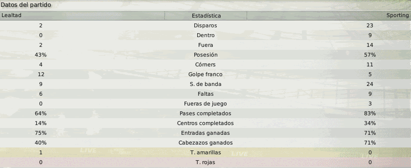 Sporting (4-3-3): Charles Itandje 7 (45' Marco Storari 7), Raúl Cámara 7 (45' Jony López 7), Michael Ball 7 (45' Canella 8), Gerard 7 (64' Iván Hernández 7), Alcides 7 (64' Jorge García 7), Alberto Lora 7 (45' De Lucas 7), Michel © 7 (45' Matabuena 7), Kike Mateo 7 (45' Carlos Alvarez 8), Miguel Ángel Angulo 7 (45' Luis Morán 7), Diego Castro 8 (64' Pedro 7), Carlos Hidalgo 8 (45' Salvatore Foti 8)