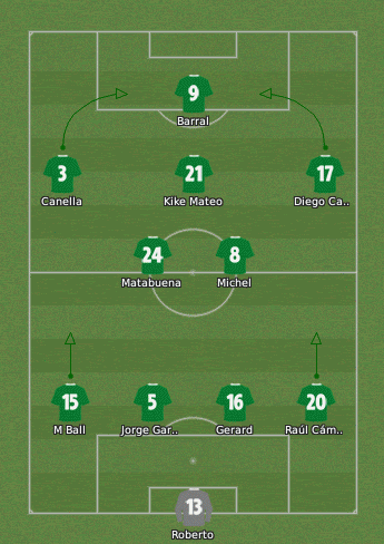 Conclusión: Increíble segunda parte!!! Fuimos dominadores durante todo el partido, pero nuestros habituales fallos en defensa nos dejaban en desventaja de hasta 3-0... para luego inciar una épica remontada con hasta 5 goles nuestros en media hora, incluyendo uno en propia puerta de Jesús Navas en un córner que sirvió para iniciar la remontada. Parece que, además, hemos redescubierto a Canella como extremo zurdo... lo desplazamos a esa posición para dar sitio a Michael Ball... y no ha empezado nada mal!!