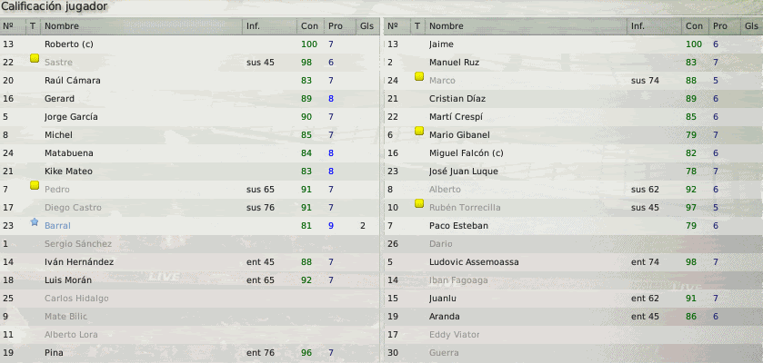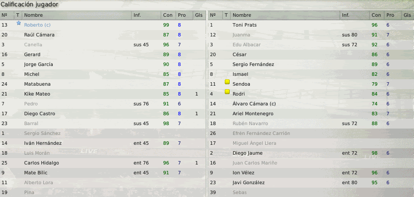 Sporting (4-3-3): Roberto © 8, Raúl Cámara 8, Canella 7 (45' Iván Hernández 7), Gerard 8, Jorge García 8, Míchel 8, Matabuena 8, Kike Mateo 8, Pedro 6 (76' Carlos Hidalgo 7), Diego Castro 8, Barral 7 (45' Bilic 7)