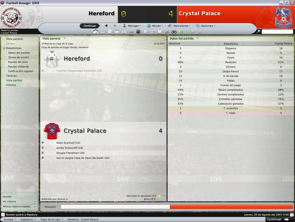 • eng.pngHereford - 0 - 4 [sean Scanell (14'), James Scowcroft (19'), Dougie Freedman (29'), Dean Beckwith (55' e/c)]; 1º Ronda de la Copa de la Liga (V)