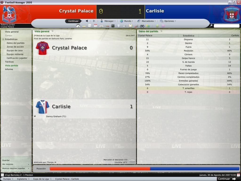 • eng.pngCarlisle - 0 - 1 [Danny Graham (71')]; 2º Ronda de la Copa de la Liga (L)
