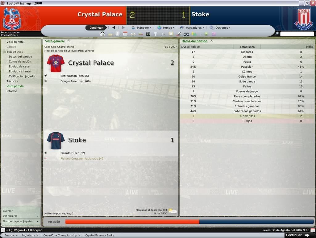 • eng.pngStoke - 2 - 1 [ben Watson (pen 55'), Dougie Freedman (66') - Ricardo Fuller (62')]; CocaCola Championship, Fecha 1 (L)
