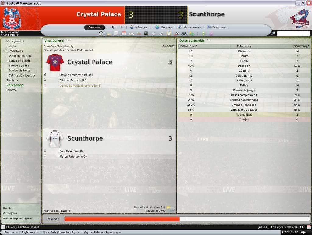 • eng.pngScunthorpe - 3 - 3 [Dougie Freedman (9', 34'), Clinton Morrison (25') - Paul Hayes (4', 30'), Martin Paterson (90')]; CocaCola Championship, Fecha 2 (L)