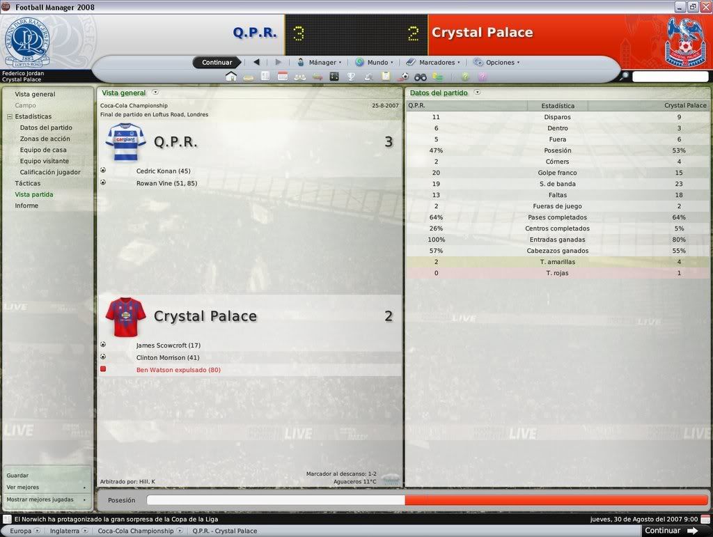 • eng.pngQ.P.R - 3 - 2 [Cedric Konan (45'), Rowan Vine (51', 85') - James Scowcroft (17'), Clinton Morrison (41')]; CocaCola Championship, Fecha 3 (V)