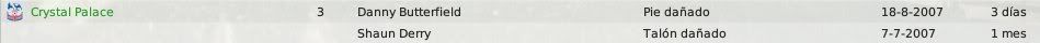 Tenemos dos jugadores que arrancaran sin jugar el mes de Setiembre. Ellos son Danny Butterfield y Shaun Derry; por suerte ambas son lesiones leves y en 2 semanas ambos jugadores estarán disponibles nuevamente.