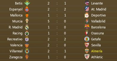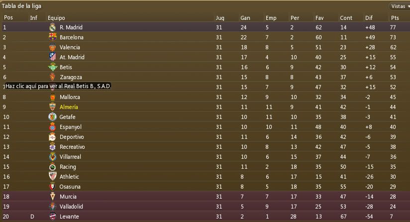 partidos que quedan??? Murcia © Espanyol (F) Real Madrid © Betis (F) Racing © Zaragoza (F) si mal no recuerdo... de todas maneras y aunque estoy buscando buenos resultados para entrar en europa, la gran temporada estará hecha se entre en europa o no, recordar que el equipo era candidato a luchar por evitar el descenso y el equipo esta hecho para estar de mitad de la clasificación para abajo, asi que todo lo que sea superar eso es un buen resultado para mí, no me obsesiono con lo de europa porque comencé esta historia para llevar a un modesto hasta lo mas alto posible pero sin preocuparme con la velocidad, no busco resultados ya... la temporada ha sido mejor de lo esperado al principio... gracias por passarte y un saludo!!
