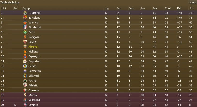 contra el depor se jugo mal y tuvimos suerte de que ellos no acertaran a porteria... estamos muy bien clasificados en octava posicion y con opciones de ir a la intertoto cuanto menos, algo impensable a principio de temporada..