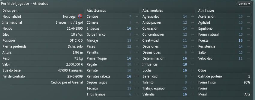hasta final de temporada y su sueldo lo pagaremos íntegramente nosotros, única condición que pusieron los "Gunners" para que la operación se llevara a cabo, no obstante la ficha sólo son 47.000 €. Destaca por un buen toque de balón aunque su punto fuerte no es la velocidad. Un poderoso físico que nos ayudará en las labores defensivas. Wenger espera que el jugador adquiera la experiencia necesaria para ver si puede contar con él en el próximo año, ya que se ha negado rotundamente a negociar por un traspaso.