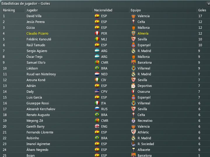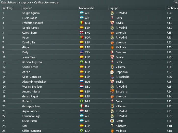 . Los máximos goleadores de la temporada pasada no están encontrando el gol con facilidad y Eto'o y Van Nistelrooy llevan 9 y 7 goles respectivamente, aunque en el caso del holandés jugadores como Agüero y Robinho le ayudan con la tarea goleadora. En cuanto a la calificación media hata el momento el mejor de la temporada está siendo el delantero del Real Madrid