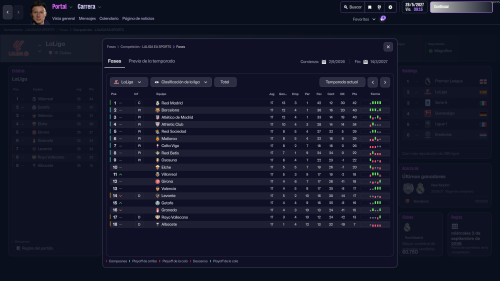Se trata de una estructura de ligas ficticia con campeonatos regionales, ademas de la liga regular y un sistema de ligas de filiales . Primera division: consta de 18 equipos en la categoria, a un solo partido, al acabar se divide en dos play off: campeonato y descenso, ambos de 9 equipos a un solo partido. 3 descensos Segunda division: 16 equipos, 30 jornadas. ascienden 2+1(play off) , descienden 2+1 Primera federacion:2 grupos, 16 equipos, 30 jornadas. Ascienden los campeones y los segundos juegan un play off,descienden 2 de cada liga mas uno por play off Segunda federacion:5 grupos, entre 14-18 equipos, entre 26 y 34 jornadas(los equipos se descuadran con el tiempo y no respetan los limites territoriales originales). Los dos primeros de cada liga juegan un playoff a sorteo. Ascienden 5 en total. 11 ligas regionales , el ganador de cada una juega el play off por el campeonato regional. Algunas pertenecen a una unica CCAA(Galicia,Madrid,etc), y otras son agrupaciones(ej: la liga del mediterraneo engloba a la Comunidad Valenciana y Murcia). Varias segundas divisiones regionales La copa del rey la juegan los 146 equipos de la estructura principal(de primera division a segunda rfef) La supercopa se juega entre el ganador de la copa del rey y la liga 4 divisiones independientes de filiales con 38 equipos a un solo partido. 8 ascensos, 8 descensos De Agosto a Octubre se juega la liga regional. Desde Noviembre a mayo las ligas regulares.