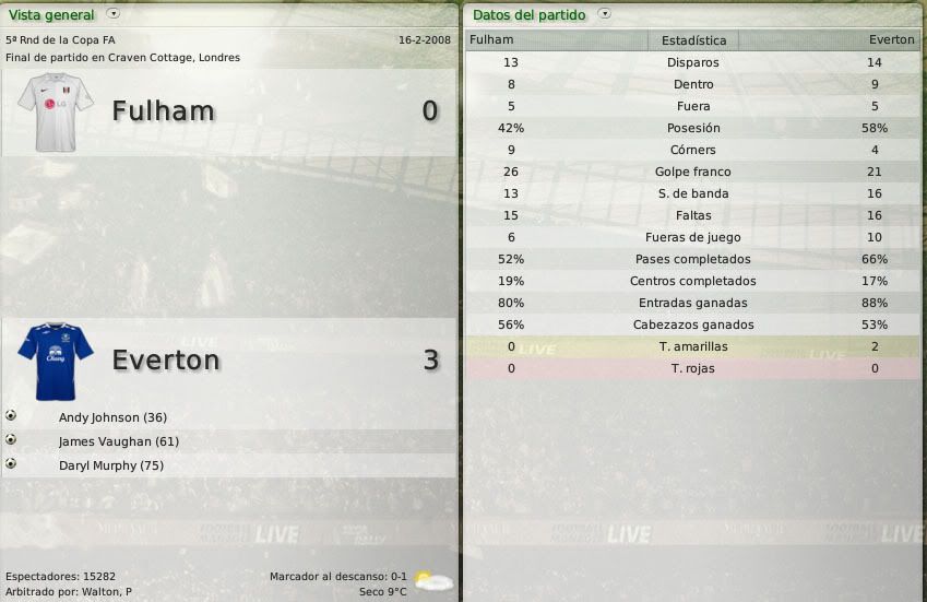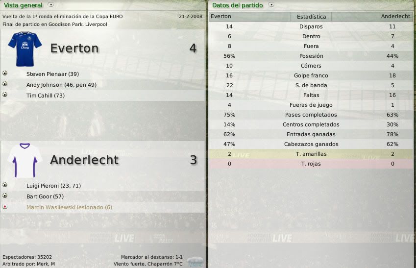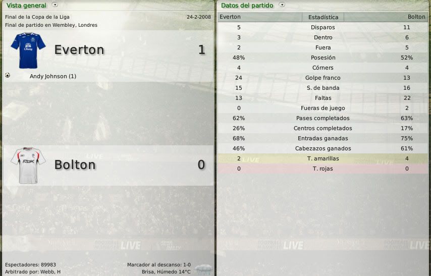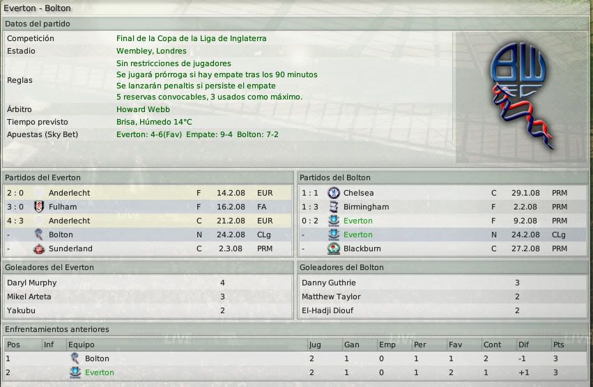 La ansiada primera final de la temporada. Partido vital ante un Bolton que tiene un equipo muy coqueto, pero que no es tanto como tu Everton al que confío la victoria.