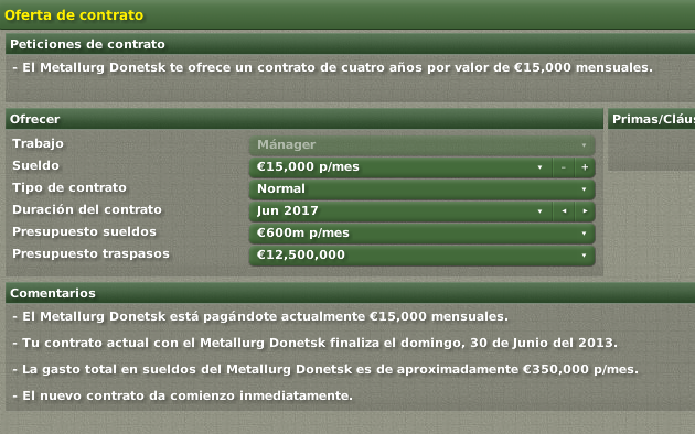 como lo pudiera haber estado con el Khimik bielorruso. Decido negociar un contrato por 2 temporadas más, y una subida de sueldo a la que finalmente el presidente no accede tras varias insistencias mías. En definitiva, las condiciones del contrato son las mismas que al inicio, sólo que dos años en vez de cuatro. Decido de esta forma