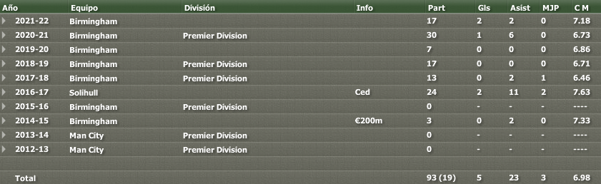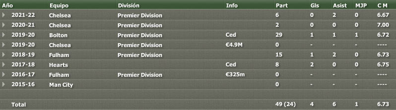 cuadro.pngtrans.pngLlega como sustituto del lesionado de larga duración Ricky Grant. Se trata de un medio creativo que encaja en nuestro esquema de juego. Nunca contó con oportunidades en el Chelsea debido a la gran competencia que hay ahí, y pese a ser rivales directos los de Londres no han puesto impedimento alguno para cerrar el trato. trans.png15 Mtrans.pngtrazz-1.pngtrans.pngPerfil - Trayectoria