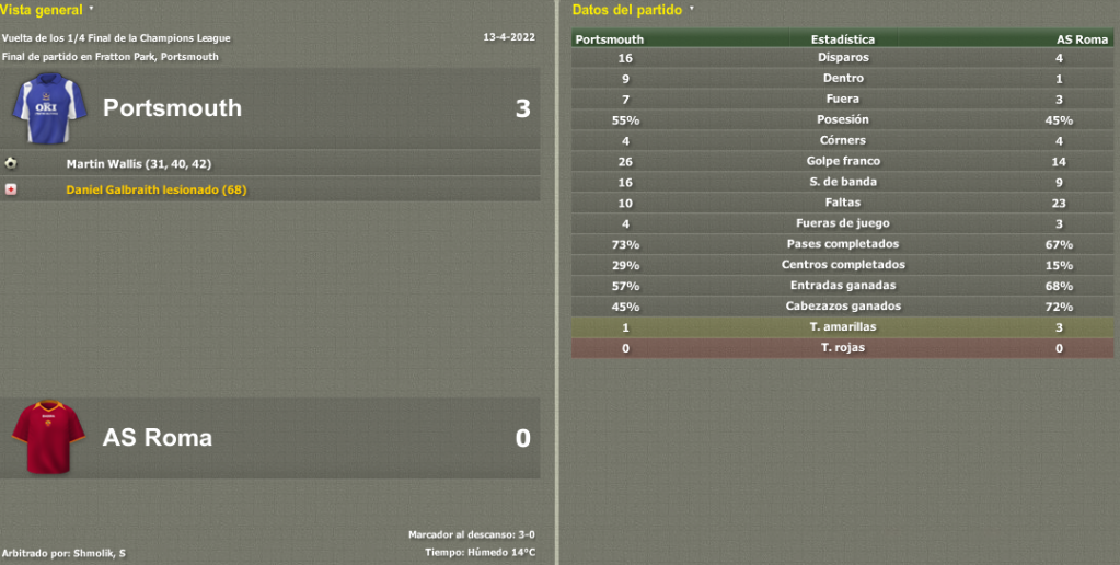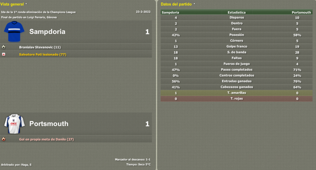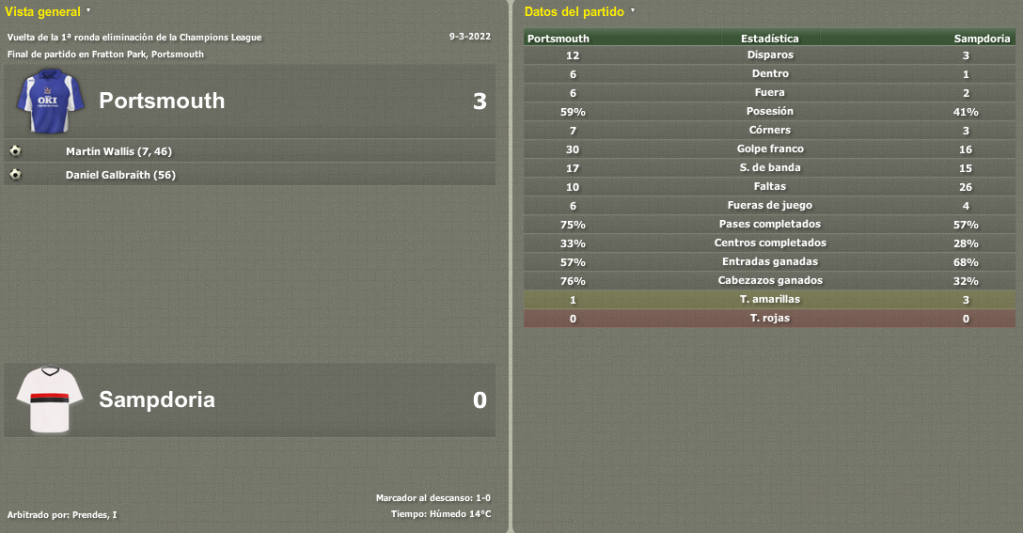 Partidazo en Fratton Park, sólo hubo un equipo sobre el campo y pronto se vio que la clasificación a Cuartos de Final estaba prácticamente hecha. De este modo me tomé la revancha con la Sampdoria, equipo que me causó problemas en el pasado cuando dirigía al modesto Khimik y al Rubin Kazan ruso.