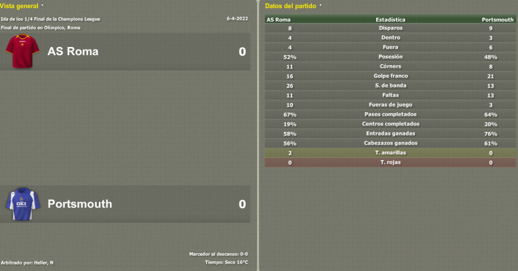 No íbamos a tardar en regresar a Italia, y es que la Roma finalmente fue nuestro rival en Cuartos. La ida en el Olímpico fue un partido gris, se vio poco fútbol a pesar de que los de Spalletti son uno de los equipos italianos que mejor propuesta ofensiva tienen. En definitiva, un partido sin historia pero que nos permitiría imponer nuestro ritmo en Fratton Park, lugar donde solemos ser un equipo muy difícil de batir.