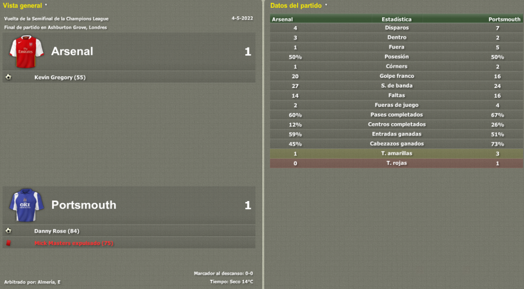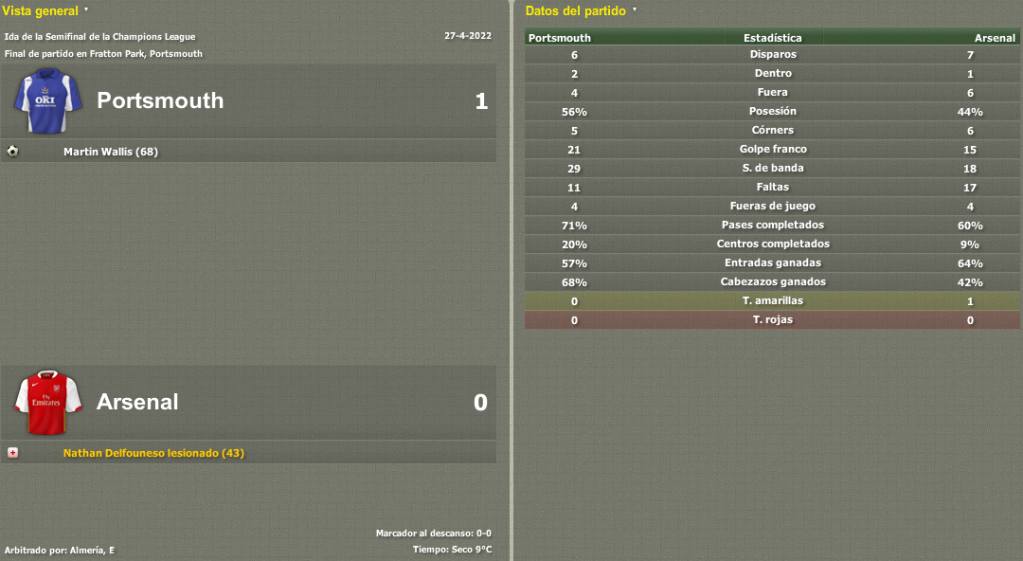 El partido de ida fue clave, ya que en esta ocasión la serie se abriría en nuestro estadio Fratton Park. Importantísimo viajar al Emirates con un resultado a favor. Y así fue, aunque por la mínima. Un gol de Wallis en la segunda parte nos dio bastantes esperanzas para el partido de vuelta, sobre todo por el hecho de no haber encajado un gol en contra. Kolinko pediría a sus jugadores máxima concentración para el partido de vuelta.