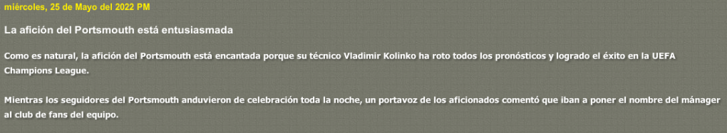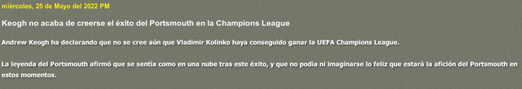 Mi mas sincera enhorabuena; has logrado algo historico para este club. Despues de ver la trayectoria hasta la final encontrarnos con el Oporto sonaba a que tenias muchas chances de salir campeones y se logro. Pase lo que pase Kolinko ya pasara a la historia como el manager que hizo campeon de Europa al Pompey, muy grande.