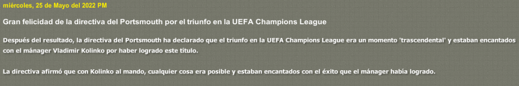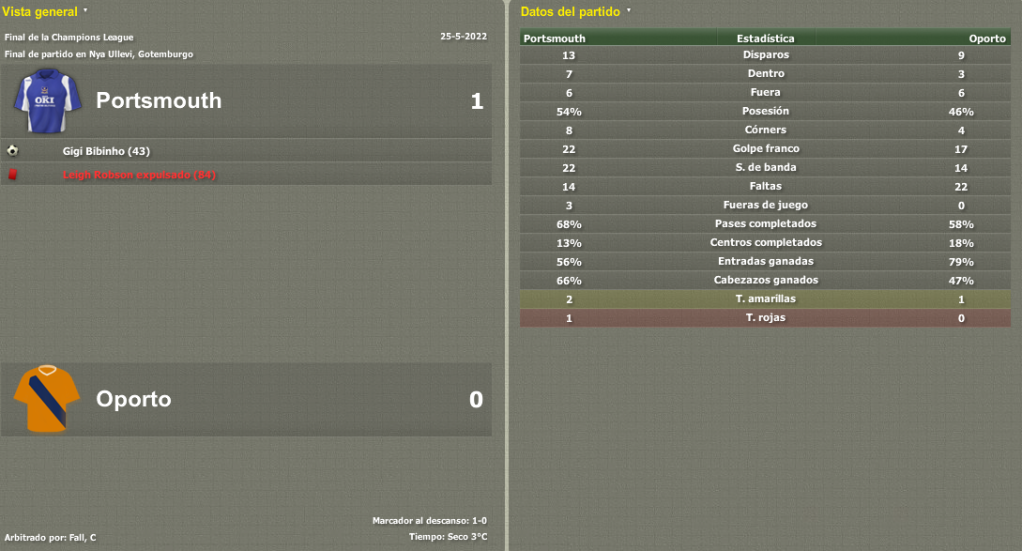 El Portsmouth inscribe su nombre entre los ilustres equipos europeos tras batir en la noche de hoy al Porto y de esta forma proclamarse campeones de Europa por primera vez en su historia. Finalmente los hombres que dirige el bielorruso Kolinko dieron la sorpresa y vencieron por la mínima en un partido que dominaron a pesar de los nervios iniciales. Fueron los portugueses quienes llevaron el peso del encuentro durante la primera media hora, y a punto estuvieron de adelantarse en el marcador. Sin embargo, los ingleses reaccionaron y el último tramo del primer tiempo fue suyo. Un buen pase de Wallis tras la incorporación al ataque de Gigi Bibinho supuso a la postre el único gol del partido. El brasileño disparó un potente tiro lejano que bien ha valido una Champions.
