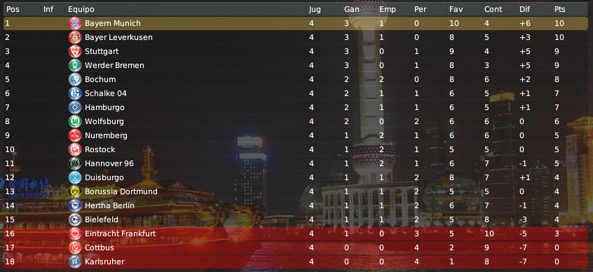 Empezó ya la Bundesliga. Se jugaron cuatro partidos y, por ahora, dominan el Bayern Munich y el Bayer Leverkusen con 10 unidades. Ambos, tienen 3 victorias y 1 empate. Atrás, los siguen de cerca el Stuttgart y el Werder Bremen que comparten la tercera posición con 9 puntos.
