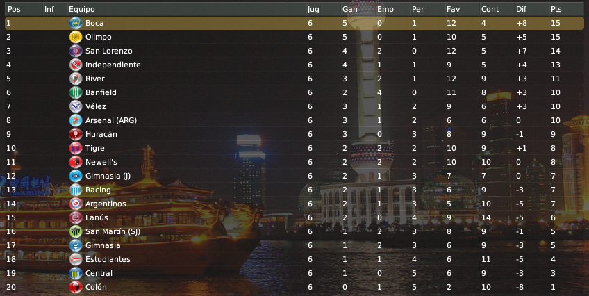 En Argentina ya llevamos un tercio de Torneo disputado. Se jugaron seis fechas y tenemos a Boca y a Olimpo como líderes con 15 unidades sobre 18 disputadas. Para estar arriba, Olimpo tuvo que derrotar a Argentinos (3-1), San Martín de San Juan (1-0), Racing (1-0), Gimnasia (3-1) y Rosario Central (2-1), mientras que Boca (su próximo rival) acabó con Racing (3-0), Huracán (2-0), Gimnasia (2-1), Rosario Central (2-1) y Arsenal (2-0).