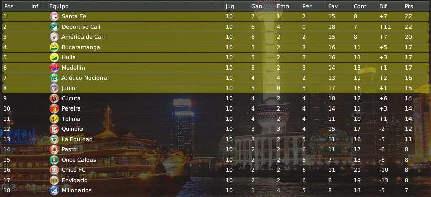 En Colombia se está disputando la "Segunda Fase" y de 17 jornadas ya llevamos 10 disputadas. Mandan Independiente Santa Fé y Deportivo Cali con 22 unidades aunque están detrás América de Cali (20), Bucaramanga (17), Huila (17), DIM (17), Atlético Nacional (16) y Júnior (15) que son los ocho equipos que entrarían a los "Play-Off" para pelear por el título de Liga.