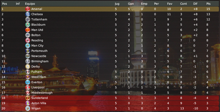 Mucho más atrás está el Liverpool de Ron Damón Rafa Benítez que se encuentra mirando de reojo al descenso con 4 unidades (16º). En la zona roja de la Tabla están Sunderland (4 puntos), Aston Villa (3 puntos) y Wigan (3 puntos), aunque, como digo, equipos como el Everton, Liverpool, o Middlesbrough deberían de empezar a sumar si no quieren pasar temores en la temporada.