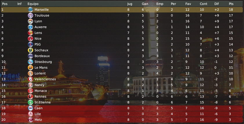 En zona de descenso, se encuentran el Lille (tiene un partido menos) y el Metz con 3 unidades y el Caen (*que caen seguro a Ligue 2 (???)*) que suma 5 puntitos sobre 24 disputados.