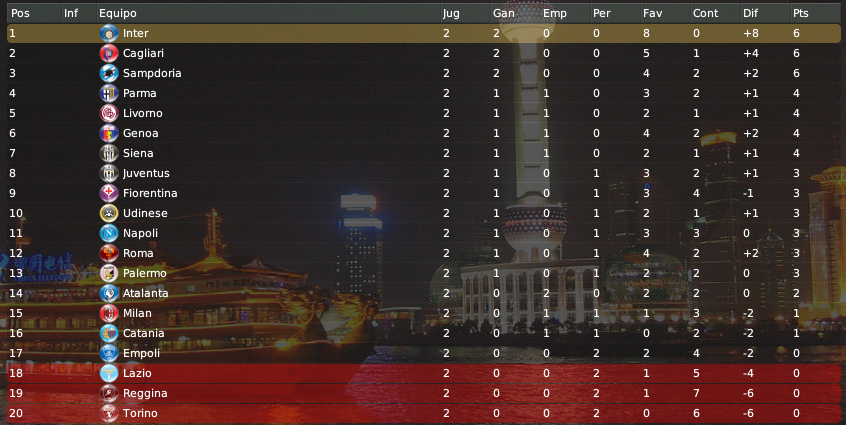 En la parte baja de la Tabla, descienden en estos momentos la Lazio, la Reggina y el Torino que todavía no lograron sumar y el Empoli se estaría salvando por diferencia de gol. Un poco más arriba, el Catania y el Milán cierran el informe con tan sólo una unidad.