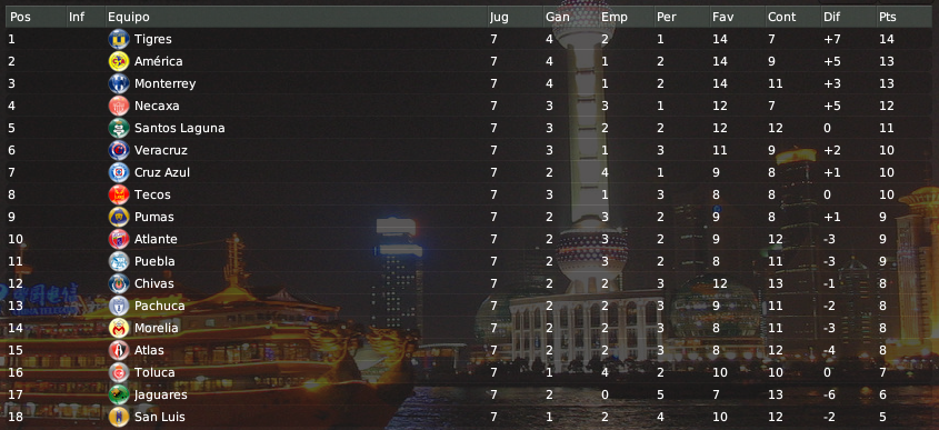 En el Torneo Apertura Mexicano tenemos a Tigres como líder (14 unidades) tras siete jornadas disputadas. A un punto están América y Monterrey (13) mientras que Necaxa (12) y Santos Laguna (11) cierran las cinco primeras posiciones. En la zona media se encuentran Cruz Azul (10) y Pumas (9) como 'candidatos'; mientras que, en la zona baja están Toluca (7), Jaguares (6) y San Luis (5).