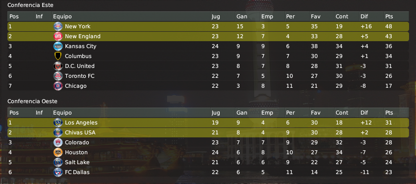En la Conferencia Oeste, manda Los Angeles que tiene algunos partidos menos y sin embargo está líder con 31 puntos. Eso sí, seguido de cerca por Chivas USA (28) y Colorado (28). Cierran la Tabla, Houston (26), Salt Lake (24) y FC Dallas (23) que, todavía, mantienen intactas las posibilidades de clasificación.