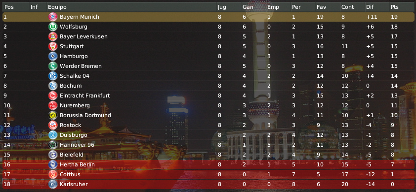 En la parte baja de la Tabla, siguen el Karlsruher (que no levanta cabeza; lleva 8 de 8 (sí, en derrotas)), el Cottbus (1 unidad), y por último, el Hertha Berlín que cierra los puestos de descenso con tan sólo siete puntos. Uno por encima, y por tanto por ahora salvado, estaría el Bielefeld junto al Hannover96 y el Duisburgo.