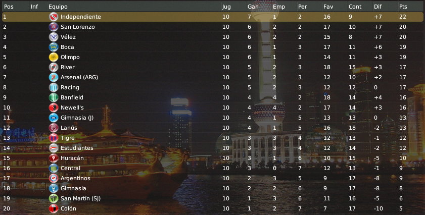 Por Argentina estamos ya en el ecuador del Torneo. Se disputaron 10 jornadas e Independiente es el equipo que está mandando. El Rojo lleva 22 unidades (7 victorias, 1 empate, 2 derrotas) y lidera la Tabla de Posiciones por delante de San Lorenzo (20) y Vélez (20) que lo siguen muy de cerca. Un poco más atrás, está Boca (19) y Olimpo (19) mientras que River se encuentra en la sexta posición, con 17 unidades.