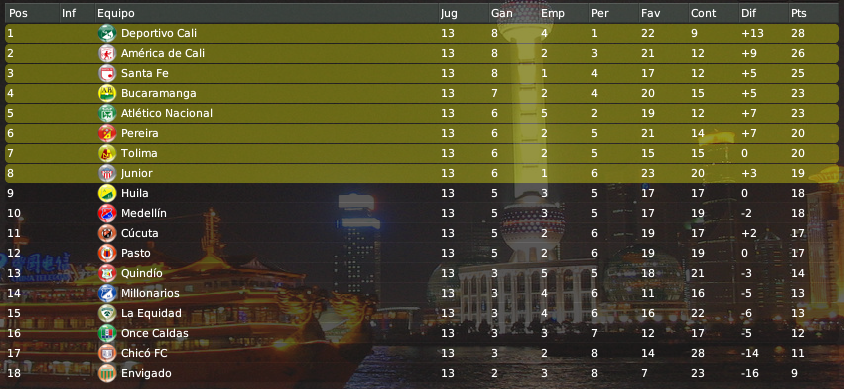 Quedan tan sólo cuatro jornadas (llevamos 13) para que acabe la "Segunda Fase" de la Copa Mustang colombiana y hay que decir que, hasta ahora los equipos clasificados a los Play-Off son los siguientes: Deportivo Cali (28), América de Cali (26), Independiente Santa Fé (25), Bucaramanga (23), Atlético Nacional (23), Deportivo Pereira (20), Deportes Tolima (20) y Júnior de Barranquilla (19).